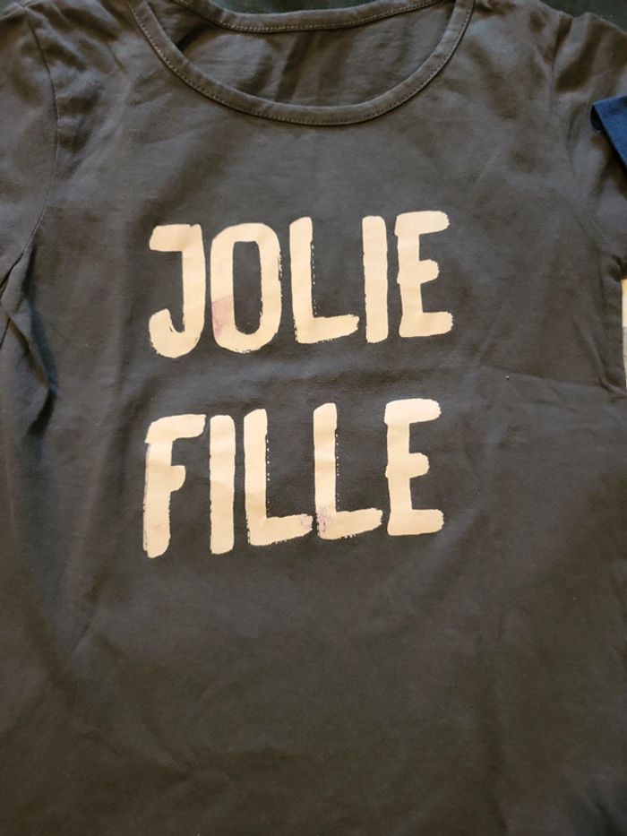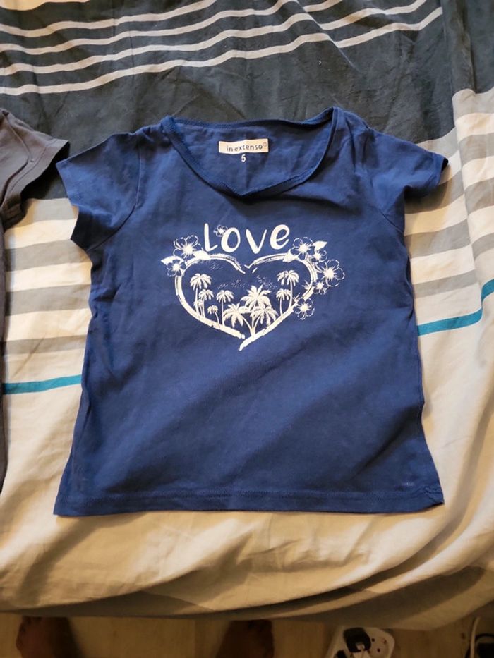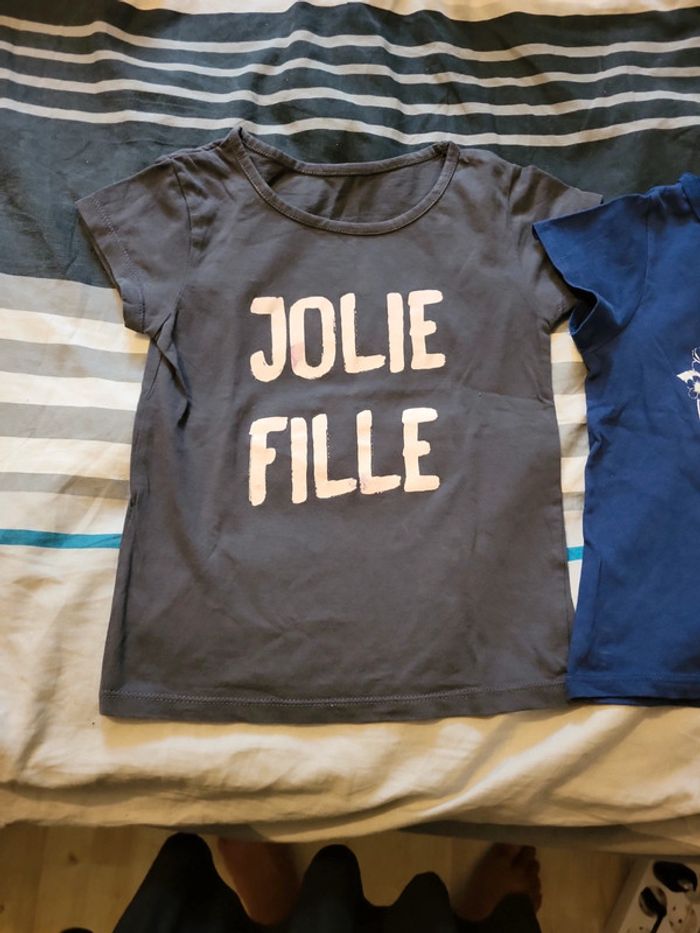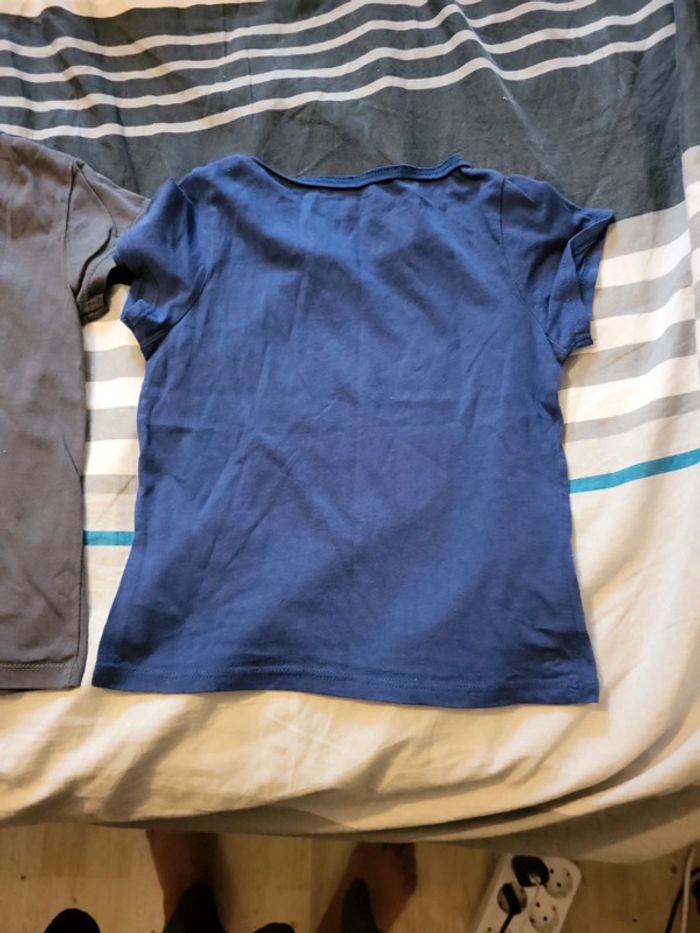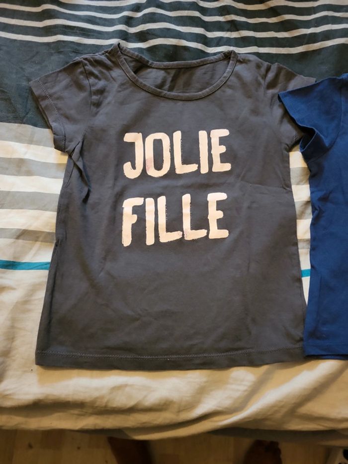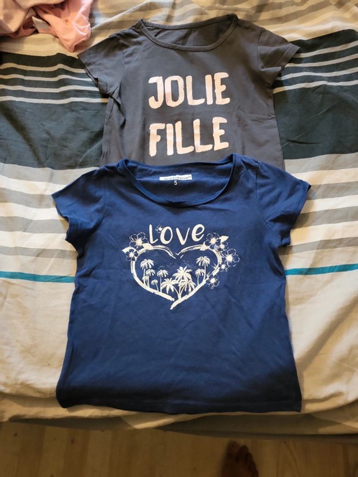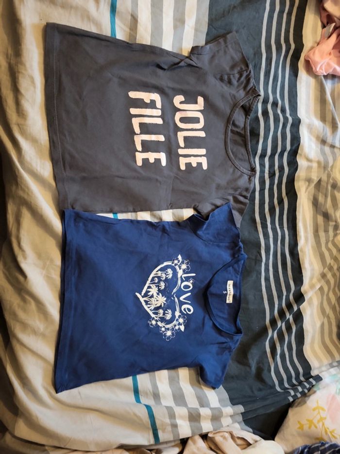 Lot de 2 t-shirts MC en très bon etat. L'étiquette du t-shirt gris est découpée et il y a une marque de feutre sur l'écriture au centre ( voir photos) #fille5ansckk91