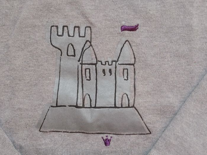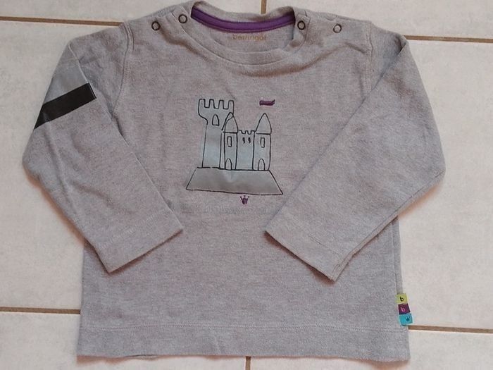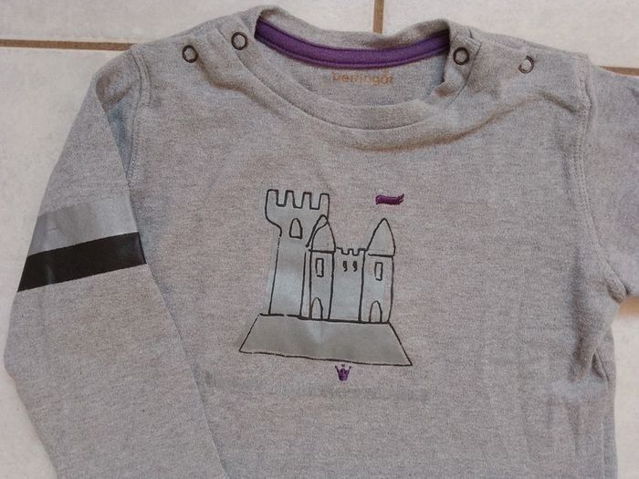 Pull garçon Berlingot 2 ans château fort. Les bandes sur la manche droite sont un peu craquelées