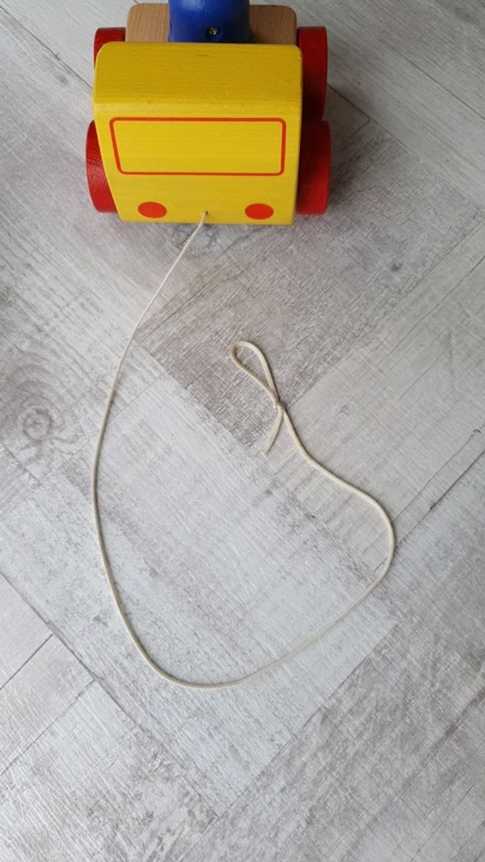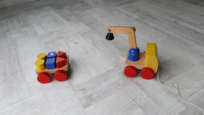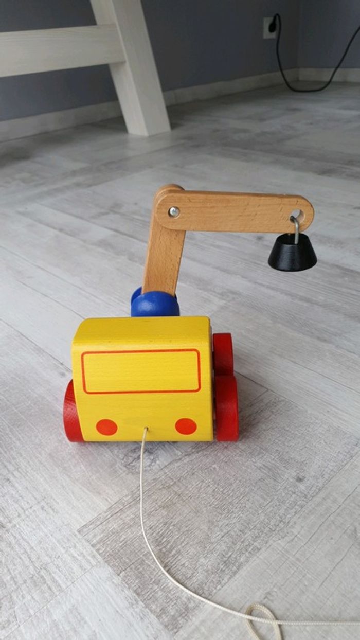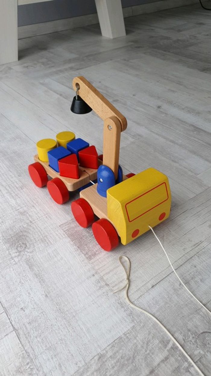 Camion grue avec sa remorque et ses cubes La remorque peut se dissocier du camion à l'aide d'une petite ficelle. Une grande ficelle a l'avant du camion permet à l'enfant de tirer derrière lui le camion Très bon état Soulever des cubes à l'aide d'une grue et les transporter dans un camion est vraiment amusant. Jouer ainsi permet de développer la motricité fine, l'esprit logique et la coordination oeil-main de l'enfant. Structure en bois solide qui supporte les conducteurs les plus exigents et les nombreux transports. La grue et les cubes comportent un aimant, ce qui facilite le levage et le chargement. La remorque se détache. La ficelle sur l'avant du camion permet de le tirer facilement. Adapté aux enfants de 12 mois et plus.
