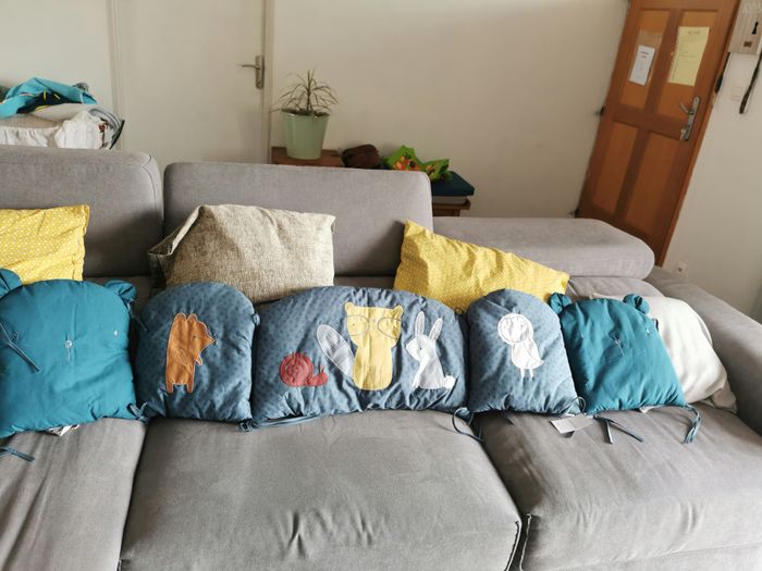 Bonjour, Je vend ce tour de lit jamais utilisé car double emploi. Totalement neuf. Il a juste été sorti de l'emballage mais totalement neuf d'ailleurs bébé n'est pas encore né ☺️👍 Marque verbaudet