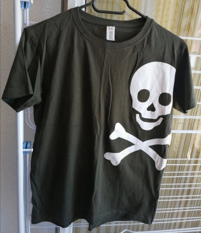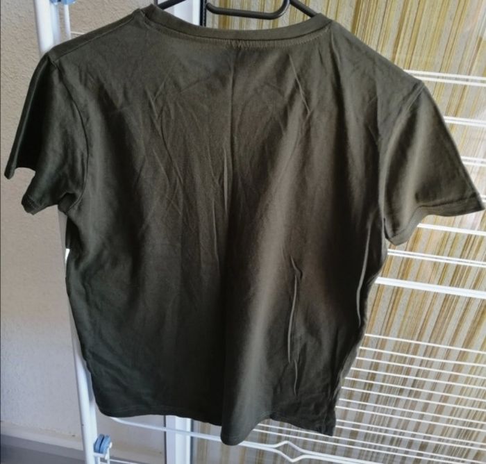 Tee-shirt kaki foncé. Indiqué 14 ans mais taille petit donc plutôt un 12 ans. 100 % coton. Neuf ! Lavé et finalement jamais porté...