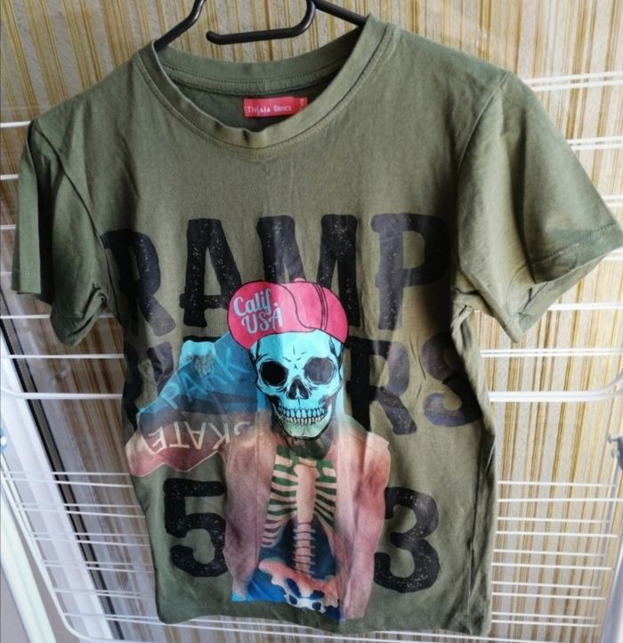 Désolée pour la présentation je n'ai pas de fer à repasser 😐 Tee-shirt kaki. Taille 12 ans. 100 % coton Neuf ! Lavé et finalement jamais porté...