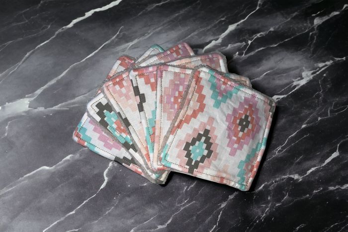 Lingettes lavables faites à la main. Une face en coton imprimé certifié oeko tex et une face en éponge bambou certifié oeko tex.