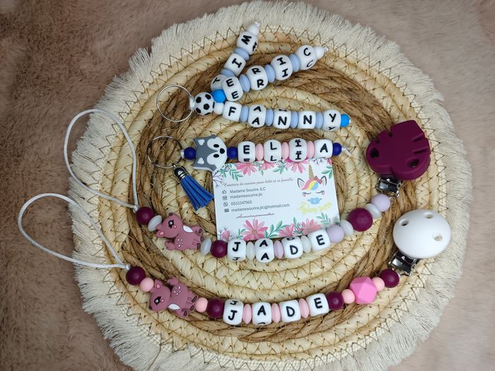 Coffret 2 attaches tétines+ 1 Porte clés 1 branche+ 1 Porte clés 3 branches liées en silicone alimentaire ou/et bois naturel 100% personnalisable. Énormément de choix de composants, vous trouverez forcement votre bonheur et si je n'ai pas, je peux le commander. N'hésitez pas à m'envoyer un message pour que l'on crée ensemble votre accessoire idéal.