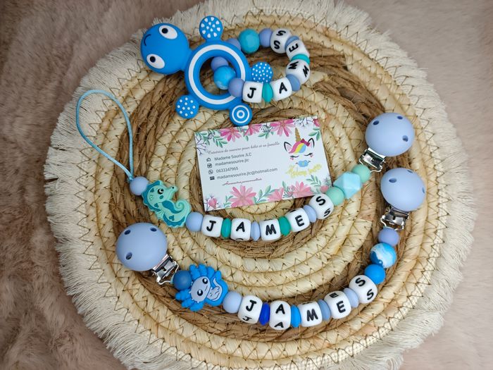 Coffret Attache tétine + Attache doudou+ Hochet en silicone alimentaire ou/et bois naturel 100% personnalisable. Énormément de choix de composants, vous trouverez forcement votre bonheur et si je n'ai pas, je peux le commander. N'hésitez pas à m'envoyer un message pour que l'on crée ensemble votre accessoire idéal.