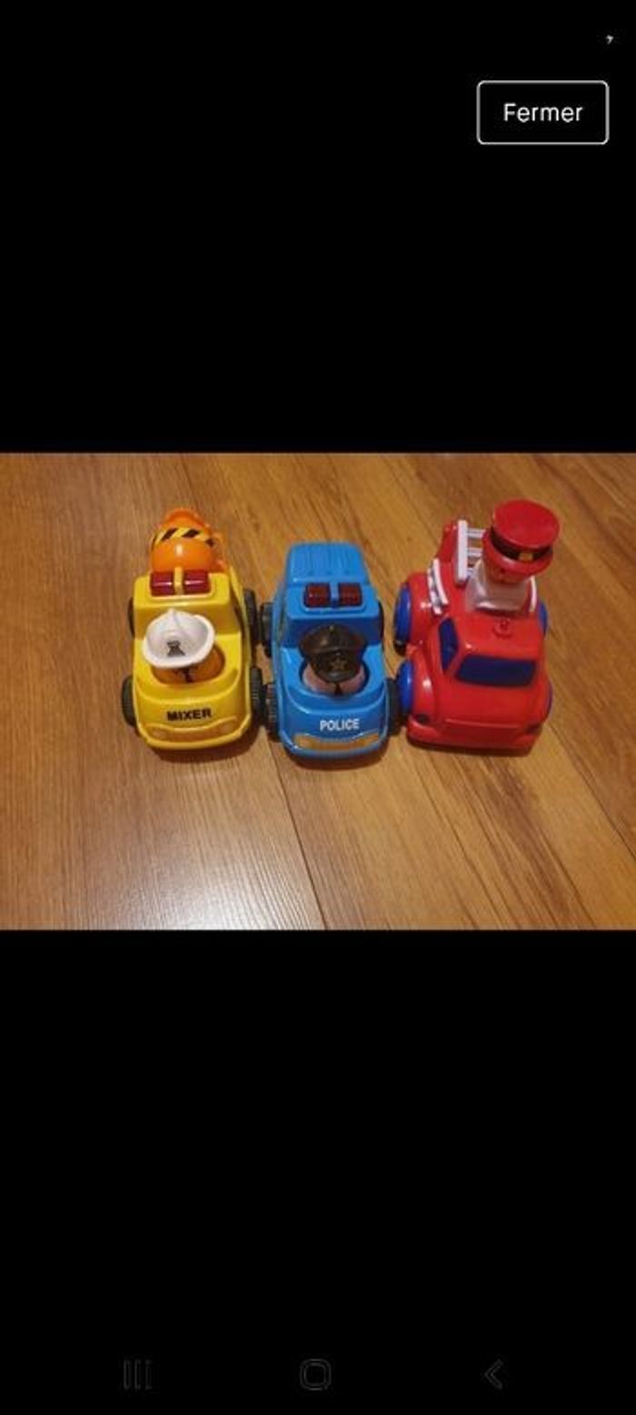 3 voitures 1 pelleteuse avec sirene 1 voiture de police avec sirene 1 voiture de pompier on appuie sur la tête du pompier et la voiture avance tout seul