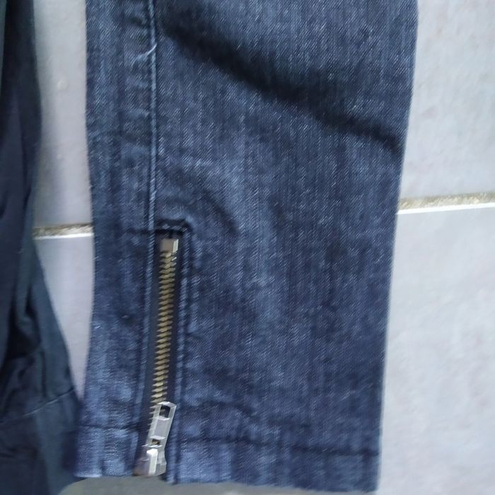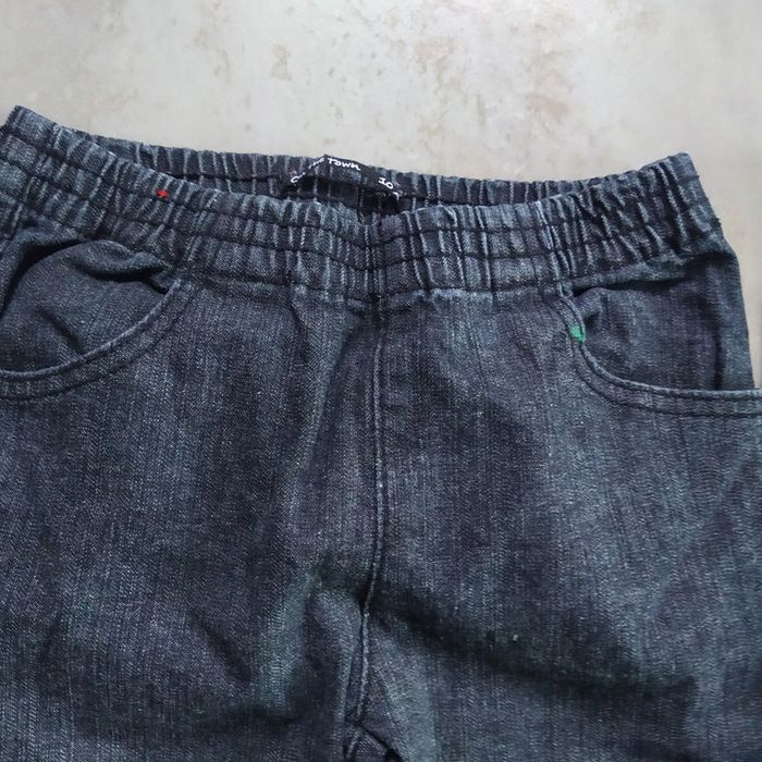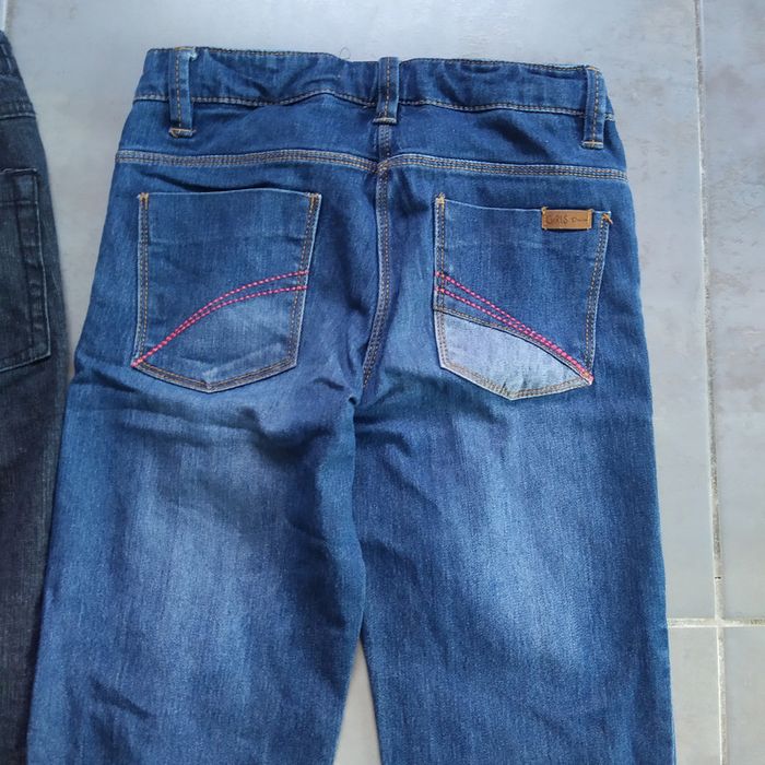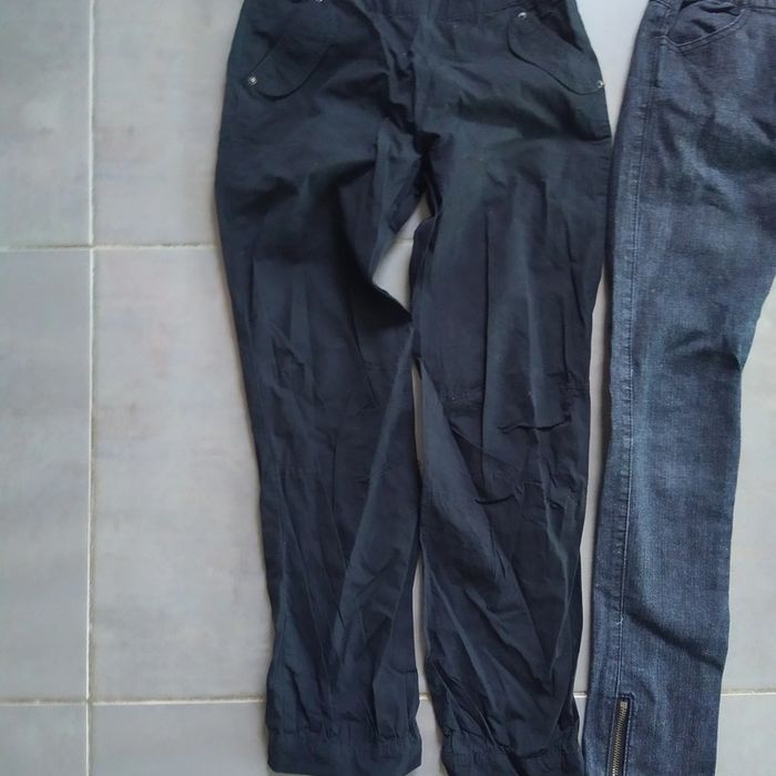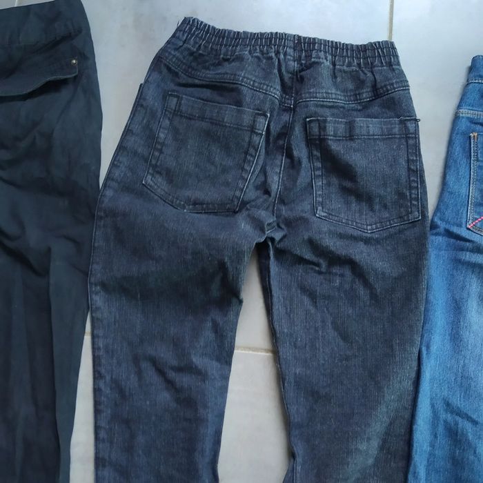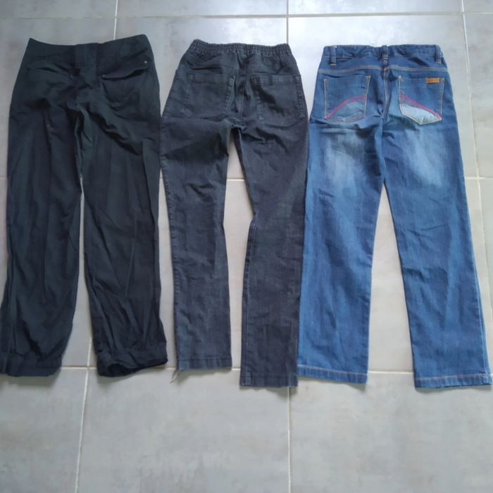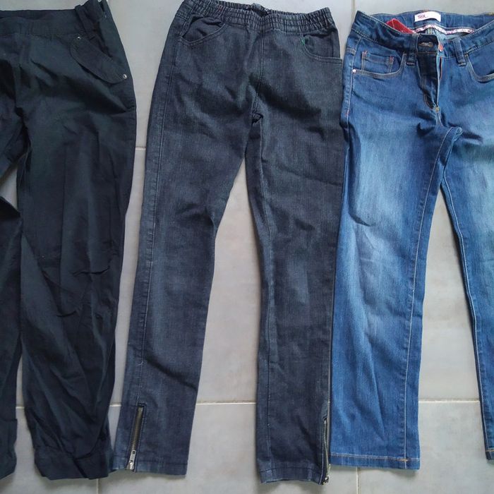 *Un pantalon noir fluide léger, ta boucle de la fermeture éclair sur le côté est cassée. Ma fille arrive à l'ouvrir et le fermer. *un jeans gris/noir taille élastique et slim pratique pour les enfants à qui il faut toujours resserrer la taille des pantalons. Une petite tâche verte à une poche. Invisible sous un tee-shirt *un jeans taille ajustable 140 cm Lot indissociable et prix ferme