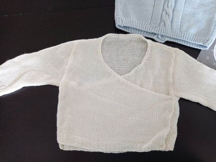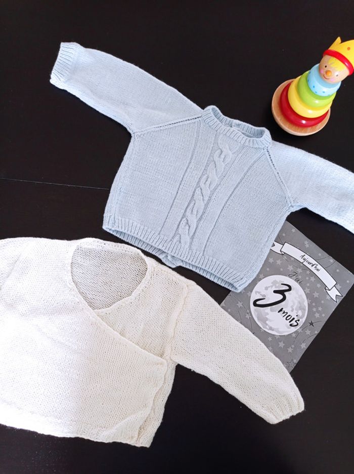 Jamais portés. Le bleu peut être mis en pull (boutons derrière) ou en gilet (boutons devant) Le blanc est un cache coeur. #bébé3mois #garçon3mois #bébégarçon