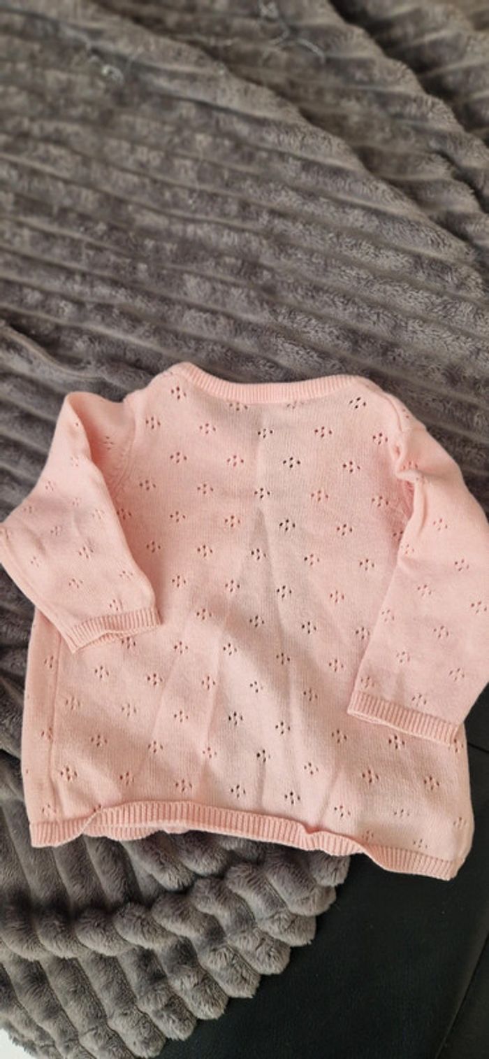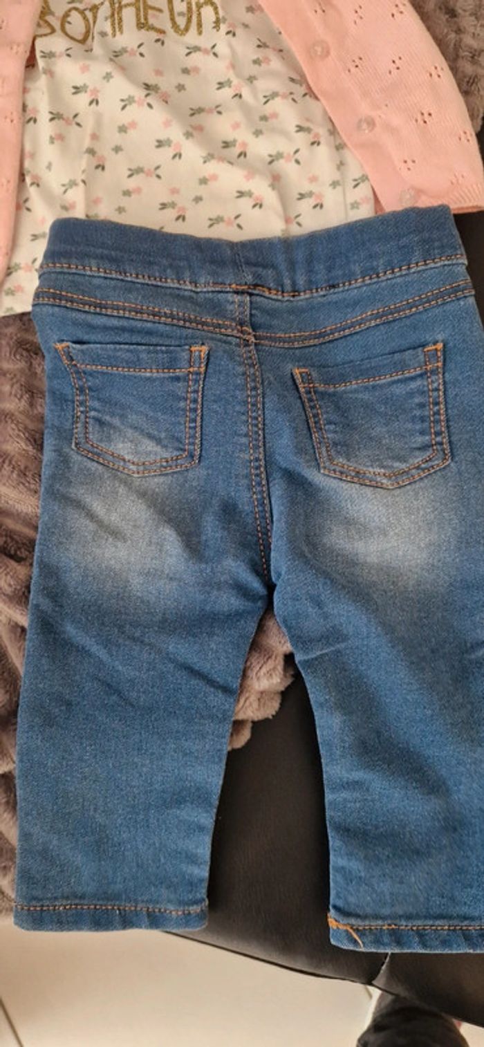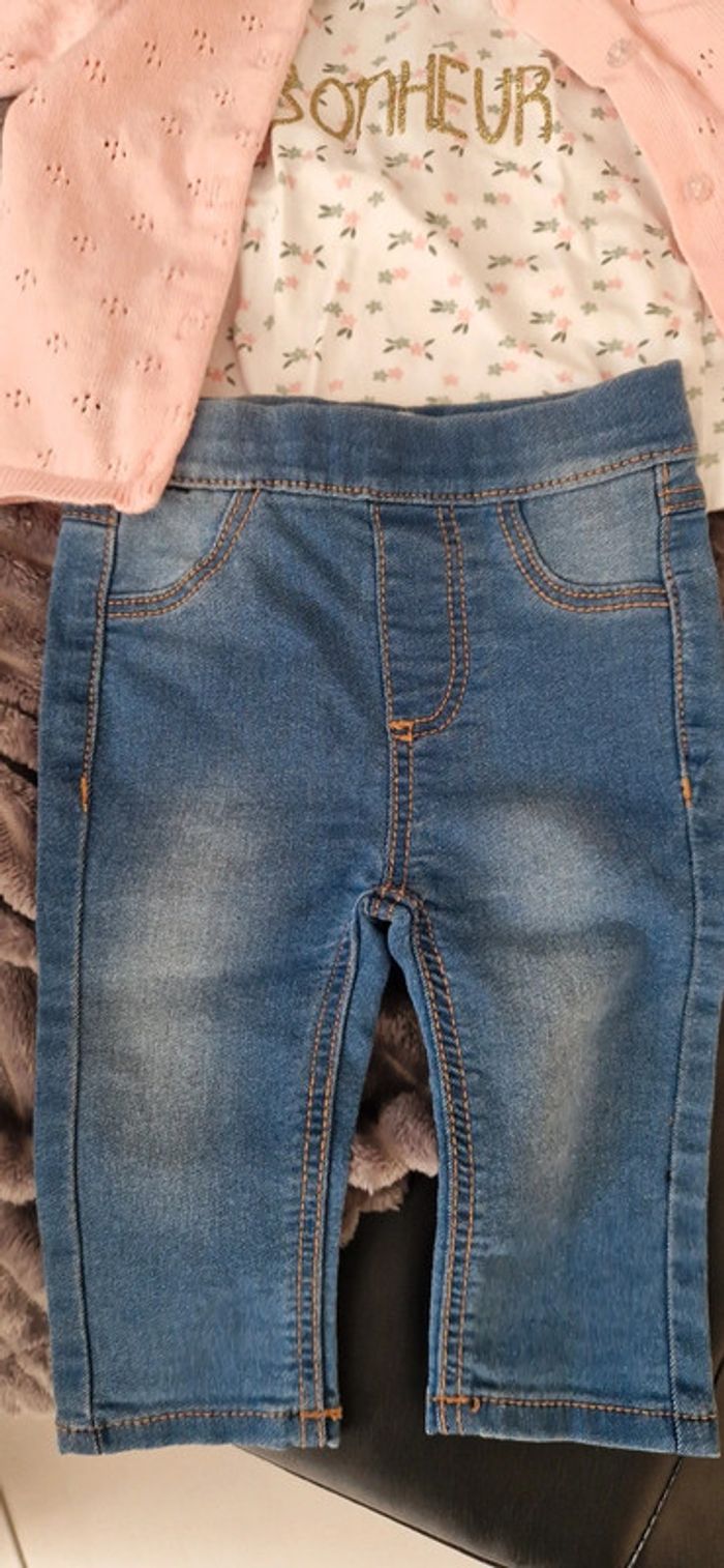 Ensemble gilet rose, t-shirt à fleurs et pantalon de jean. Le pantalon rose est offert car il a un défaut (cf photos) Taille 3 mois