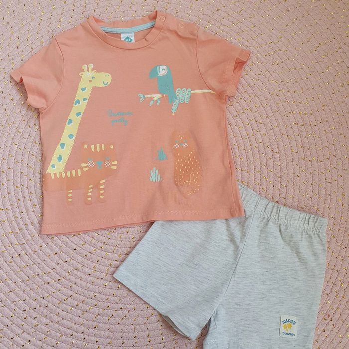 Ensemble de Marque TeX composé d'un t-shirt manches courtes et d'un short. Coloris abricot/gris. Short taille élastique. Taille 18 mois. #ltdj18moisgarcon #ensemble18moisgarcon #ensemblegarcon18mois