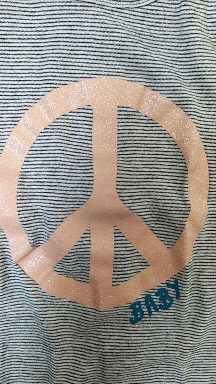 T-shirt kitchoun, 6 mois, ML, peace and love, paillette, en très bon état. Pressions ok. Voir photos. #6m_djlaurita