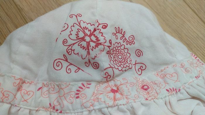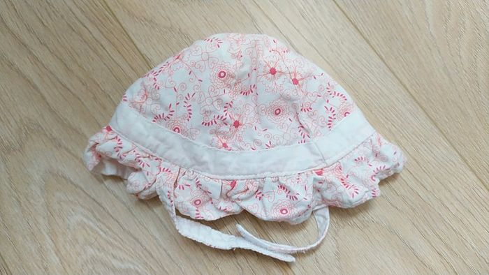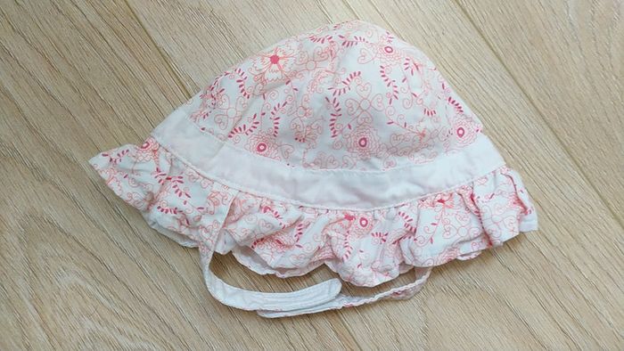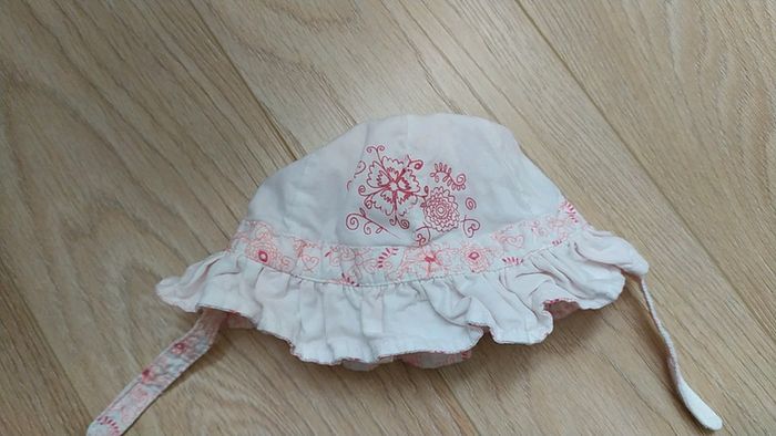 Chapeau été réversible, 1 à 3 mois. En bon état général. Scratch pour attaché au cou. Voir photos. #1m_djlaurita