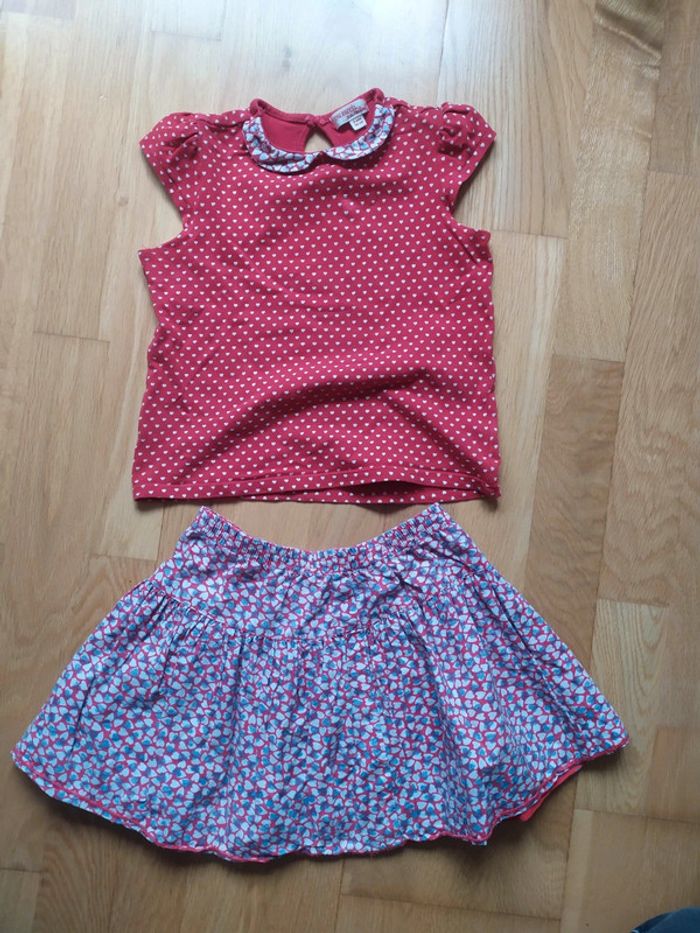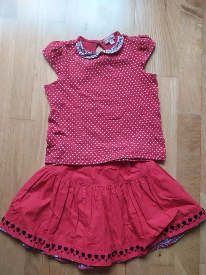 Jupe et petit tee shirt col Claudine. La jupe se retourne pour avoir un autre motif. Motifs petits coeurs Porté mais reste en bon voire tbon état #36moisfillevaloeuf