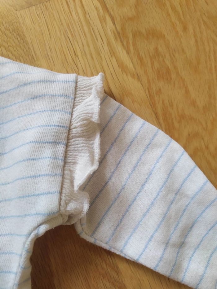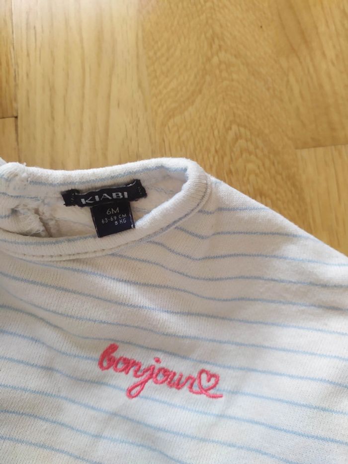 En très bon état À rayures blanc et bleu clair Écrit bonjour en rose Volants au niveau des épaules 6mois #6et9moisfillevaloeuf