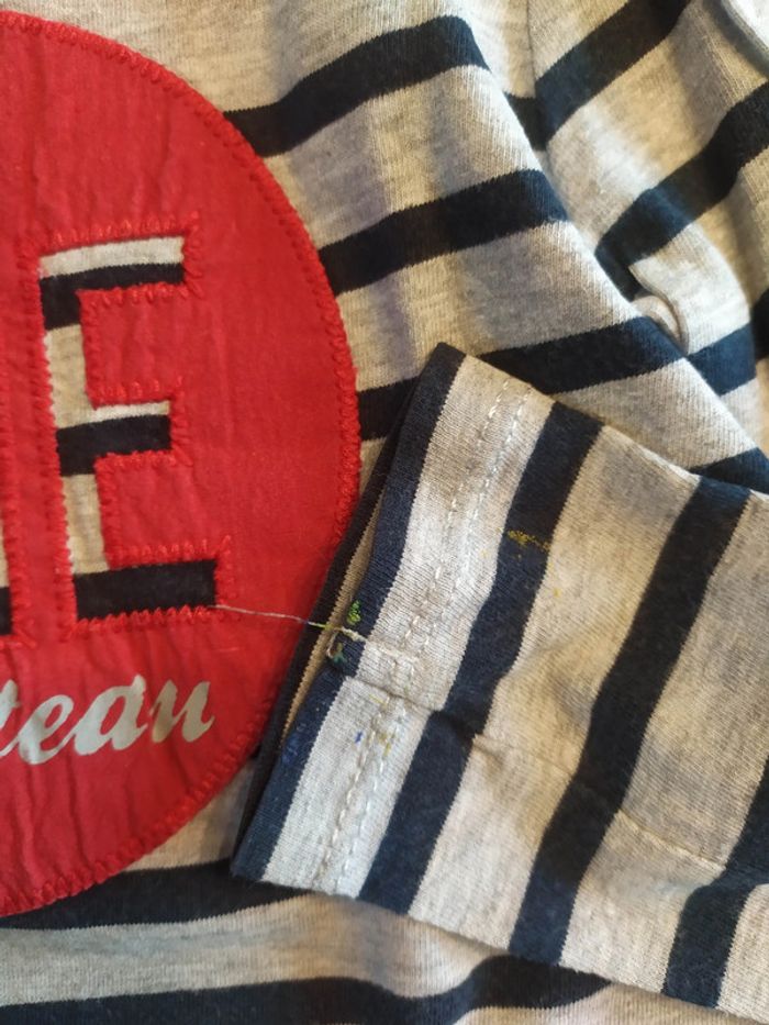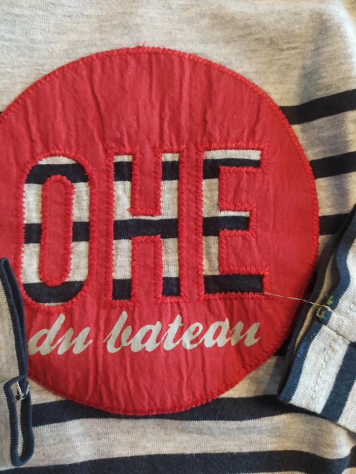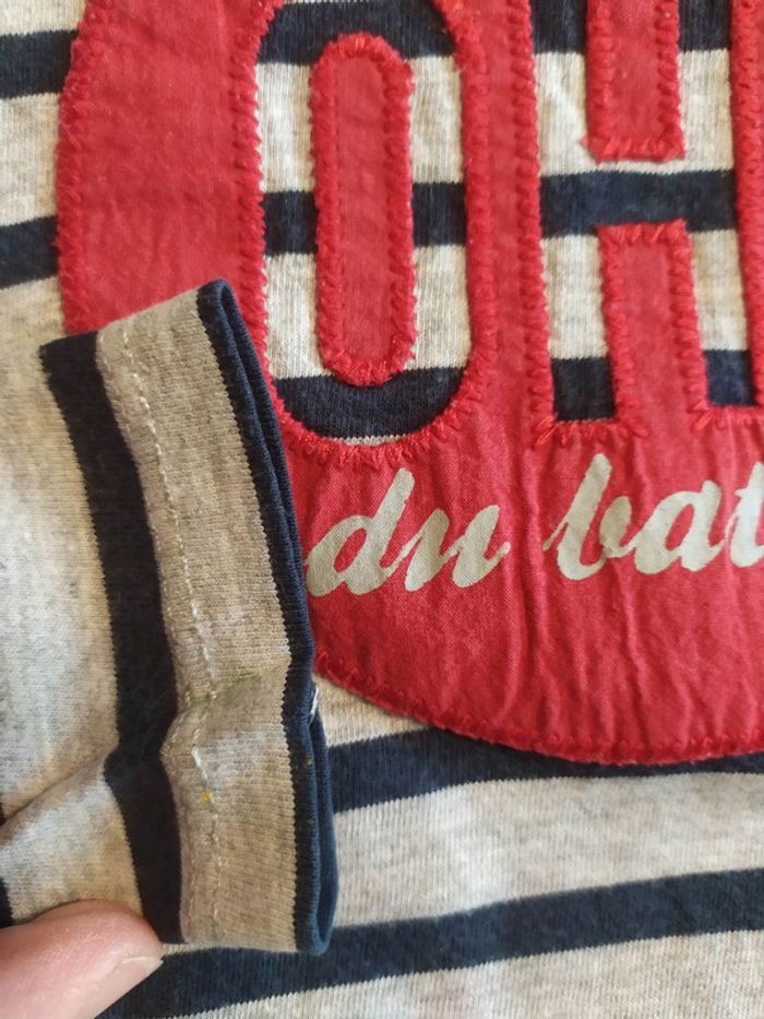 Adoré par mon fils, beaucoup porté. Reste en très bon état mais malheureusement quelques tâches de peinture qui ne partent pas à l'extrémité des manches... Écriture rouge ohé du bateau #24et36moisgarçonvaloeuf