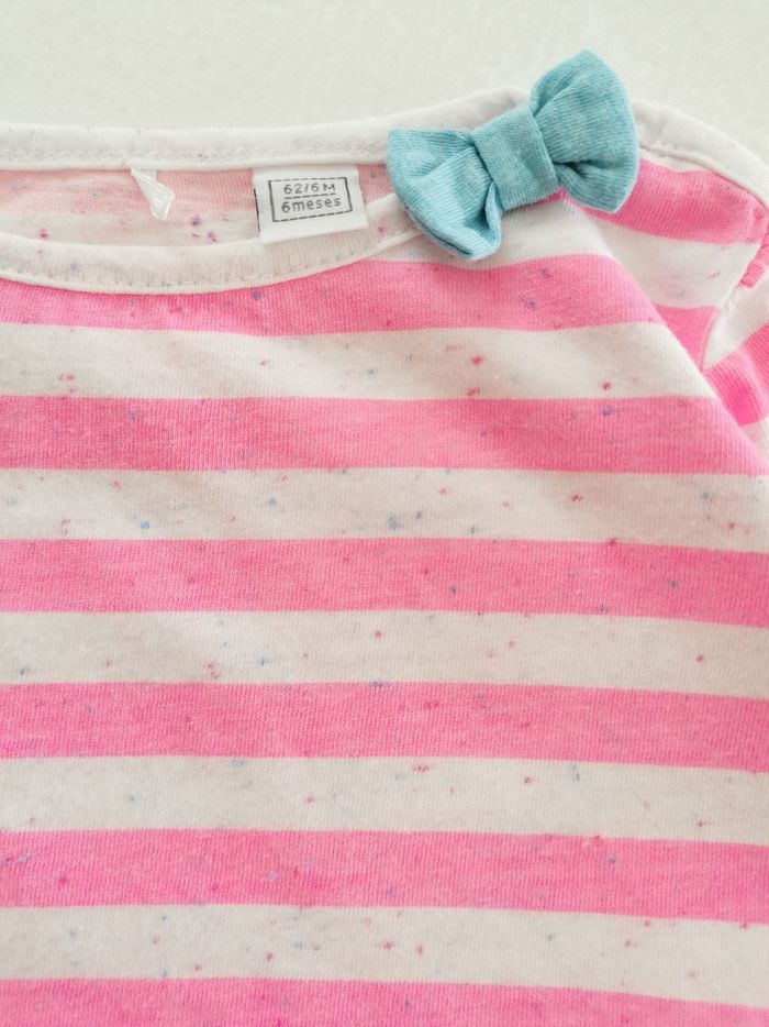Tee-shirt rayé 👧 Chicco Taille 6 Mois - 62 cm • Matière: 98% coton - 2% polyester • Tissu moucheté à rayures rose • Manches longues • Fermeture par bouton pression sur chaque épaule • Petit noeud 🎀 bleu pastel sur le col Parfait état 👌, très peu porté