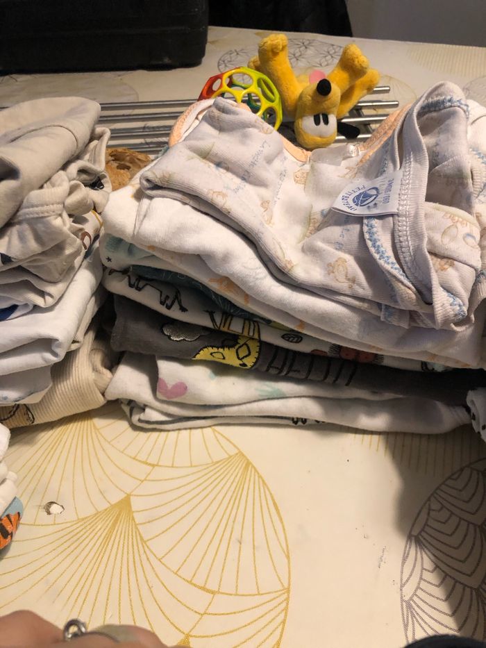 Lot de 52 vêtements 2 short 1 haut de pyjama 5 pantalon-jogging 4 pyjamas légers 7 pyjamas chaud 10 bodys manches longues 11 bodys manches courtes 7 combinaison short 5 pull- tee shirt