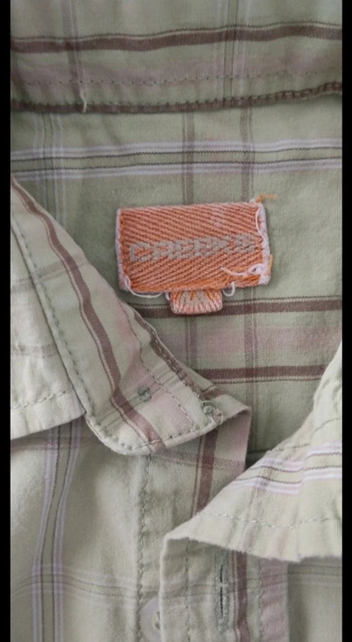 Chemise garçon Portée 2 fois Vert pâle à lignes marrons claires Taille notée: 4ans Marque: Creeks Réduction sur les lots activée #4ans_laurence8777