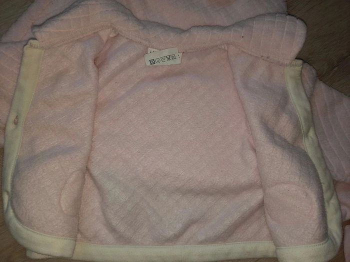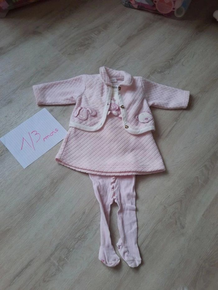 Taille 0-3 mois exactement T shirt manche longue beige à pression Robe et veste effet polair retro. Veste à bouton Neuf mais passé une fois en machine Premiere main maison non fumeur #laul57babyfille1mois