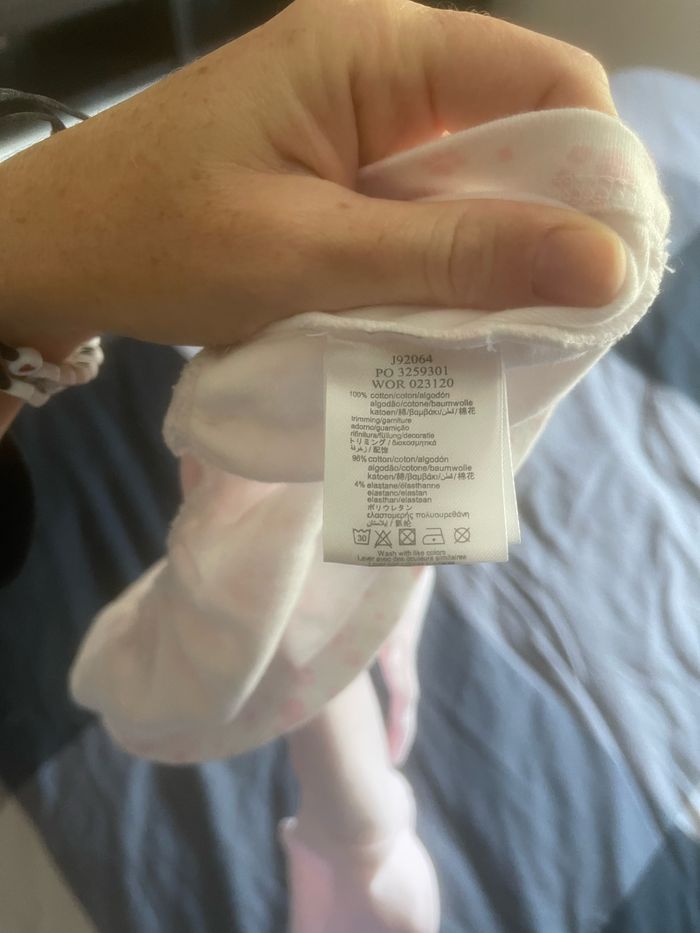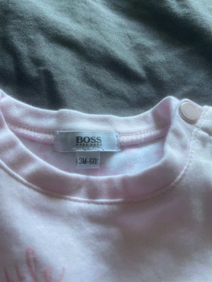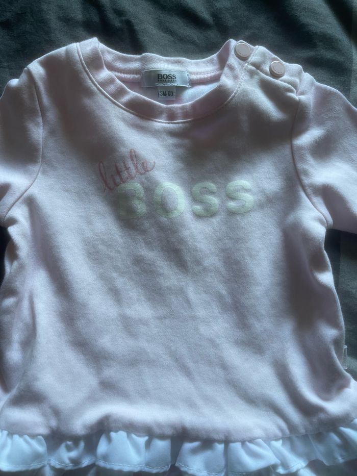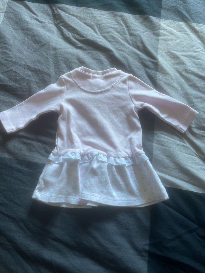 Jolie robe little boss portée 1 seule fois à peine 1h .. qualité confortable, stretch 2 boutons pression sur le côté Taille 3 mois Le haut de la robe est rose et le bas est blanc avec des pattes rose (voir photos)
