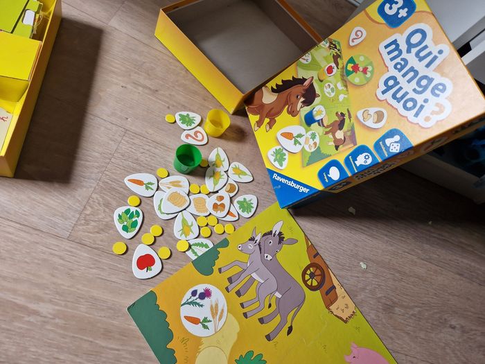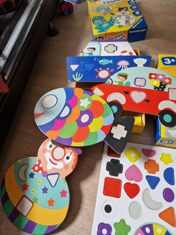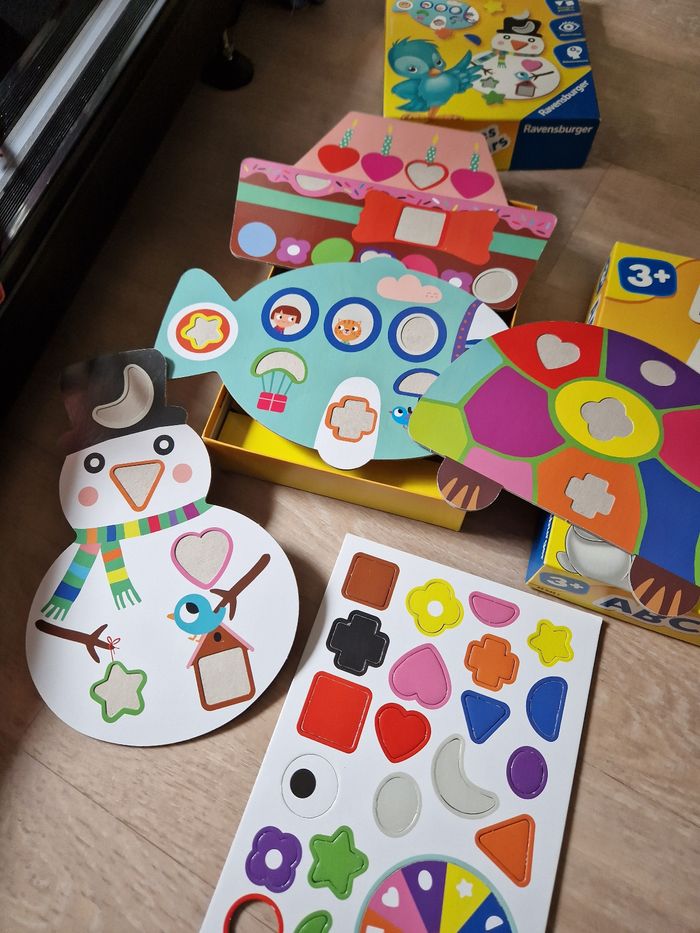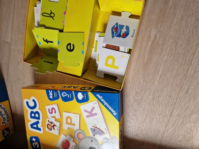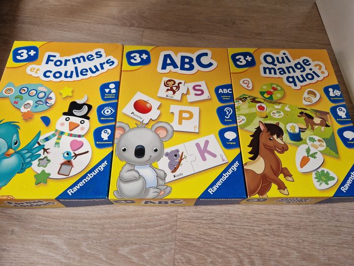Trois Jeux Ravensburger en parfait état, parfait pour apprendre en s'amusant. À partir de 3 ans les trois jeux. Il manque juste un rond rouge dans le jeux "forme et couleur" sinon tout est complet. 15€ le jeux, 35€ le lot de trois. Prix négociable dans la limite du raisonnable. Merci 😊.