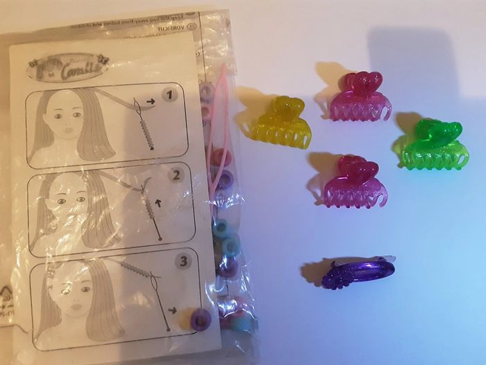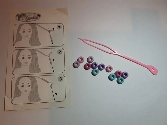 Accessoire pour cheveux Ustensile pour enfiler des perles + 12 perles 4 barrettes pince (manque 1 cran sur les 2 roses) 1 barrette à clip #accessoireenfanthypnose156