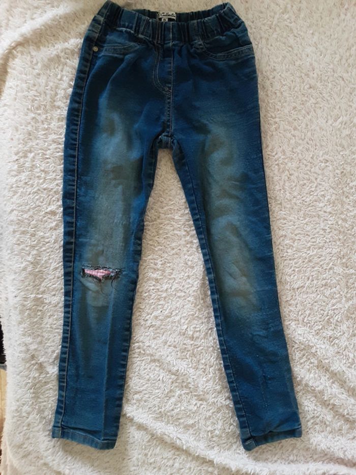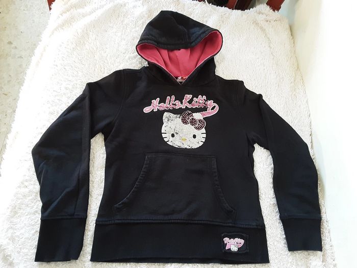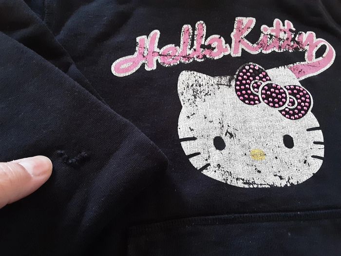 Lot vêtements usés (pour jouer dehors) 1 sweat à capuche Hello Kitty (recousu sur une manche et dessin usé) 1 jean U collection (réparé sur un genou devant et petit trou derrière au bas d'une poche) 1 pull Gémo (petit trou derrière en bas) 1 t-shirt Bilook 1 t-shirt Punkidz (taché derrière) 1 jean (troué au genou devant et petits trous derrière #10anshypnose156