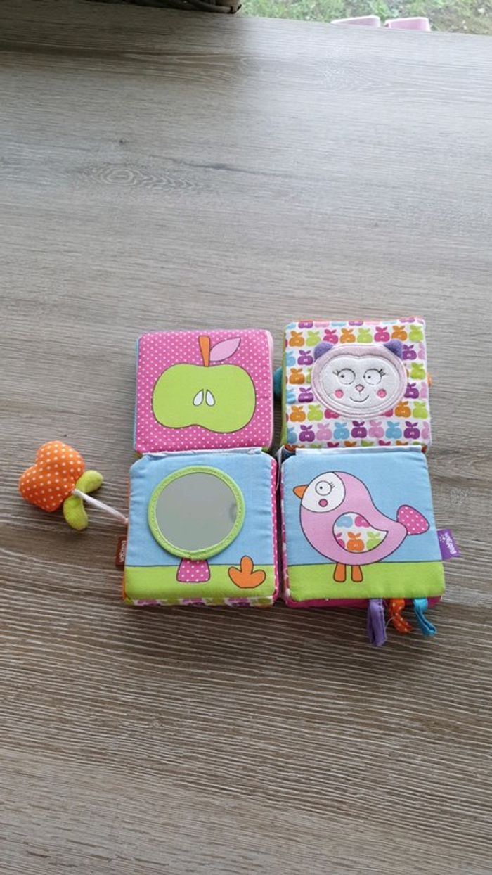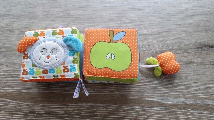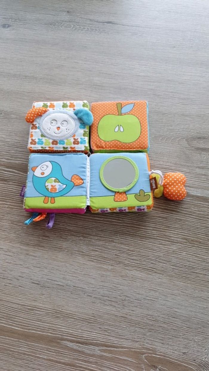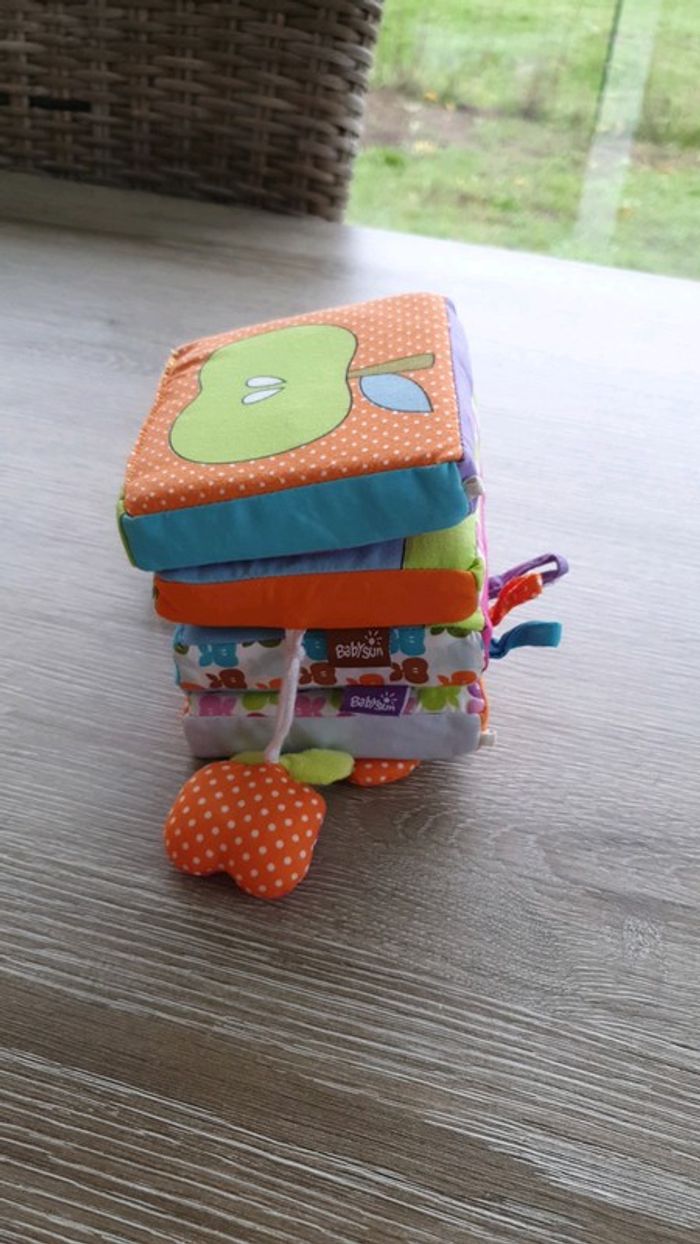 Cube d'activité qui se transforme Il y a un pouic pouic, un miroir, papier froissé, la pomme fait également un bruit de billes Très bon état Marque Babysun