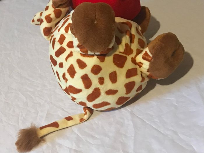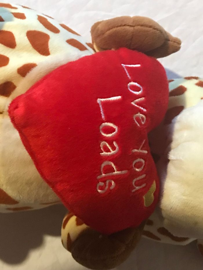 Grosse Girafe avec un Cœur Rouge Ecriture "Love You Loads" sur le Thème de l'Amour "Animal - Faune". Animal de la Savane. Peluche pour les Petits Enfants et les Bébés. ☑ "Grosse" Girafe. ☑ "Gros" Cœur. ☑ Ecriture "Love You Loads". ☑ Savane. ☑ Animal - Faune. ☑ Amour. Spécifications: Dimensions de la Girafe: Env. 40 x 23 x 20 cm Couleurs Dominantes: Jaune - Marron Couleur du Ventre et du Museau: Blanc Couleurs du Cœur: Rouge - Blanc - Jaune Couleur des Pattes, des Mains, du Bout de la Queue et du Bout des Antennes: Brun Couleurs des Yeux: Blanc - Noir Couleur de l'Intérieur des Oreilles et des Narines: Rose NB: Le Derrière de la Tête a déjà été Recousu (Voir la Dernière Photo) Réf: pe30