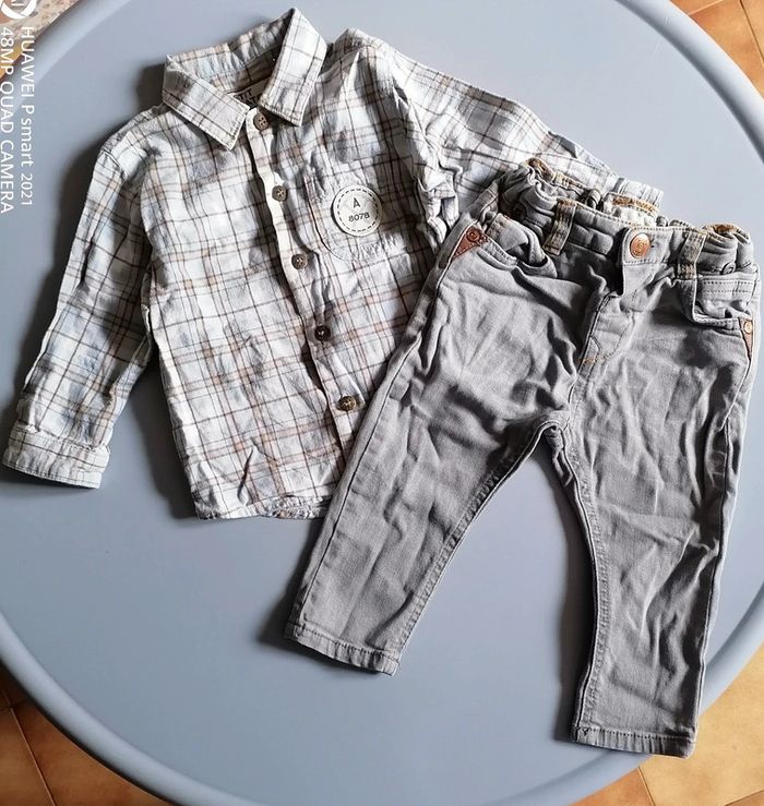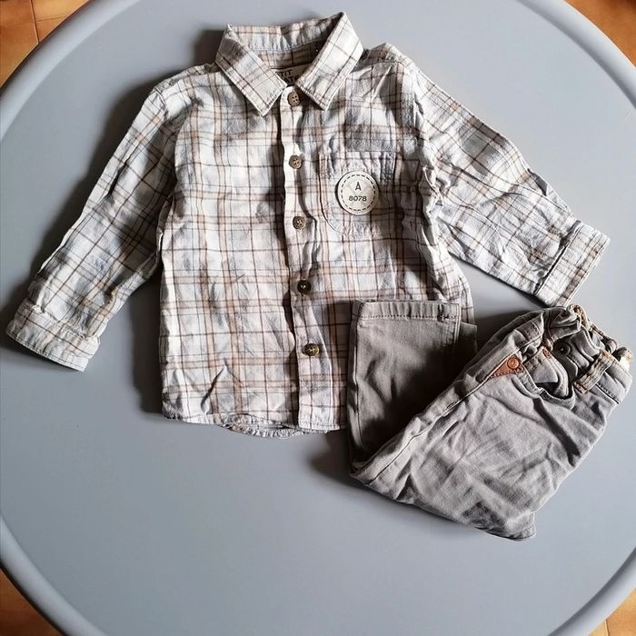 #romantictbe #romantic12mois Ensemble jean Zara gris, taille ajustable et chemise à carreaux assortie (sans marque). Très bon état