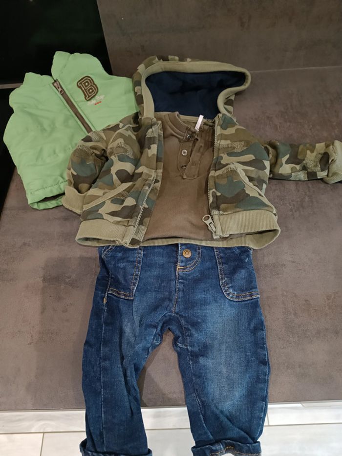Ensemble 6 mois Jeans tao Veste sans manche Gilet a capuche kiabi Pull kaki orchestra Tbe