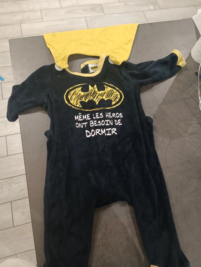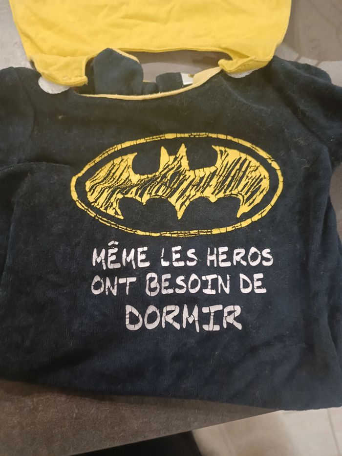 Pyjama Batman avec sa cape 9 mois Couleur légèrement passe et écriture légèrement craquelé mais fais son petit effet