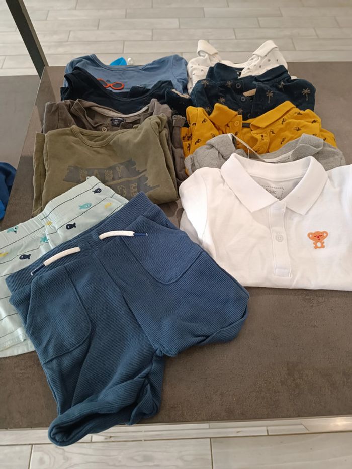 Lot été 18 mois Composée de 4 t shirt Deux short dont un neuf sans étiquette 5 polo donc un neuf avec étiquette Soit 11 articles pour 18 e Tbe