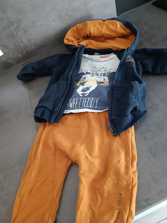 Ensemble décontractée 12 mois Composée d'un t shirt manche longue ours D'un gilet a capuche Et d'un jogging Tbe