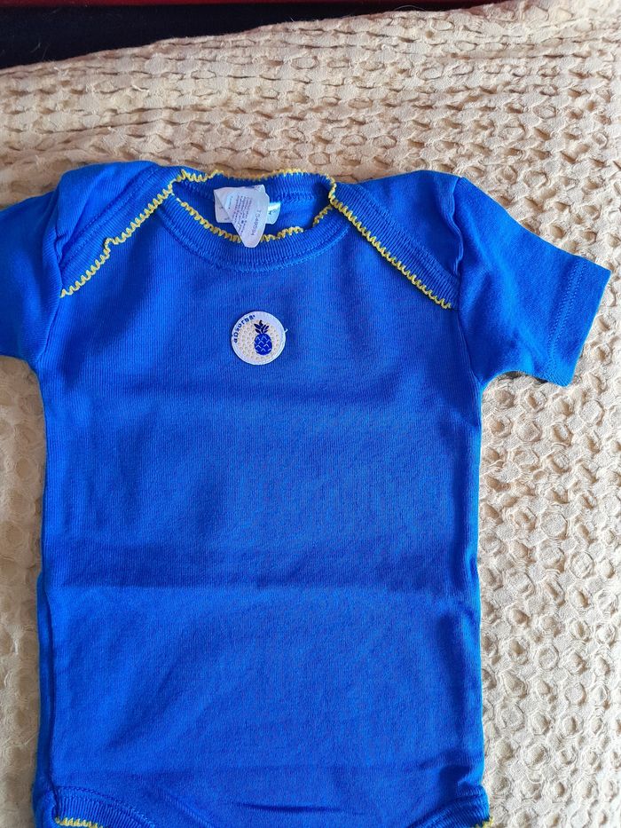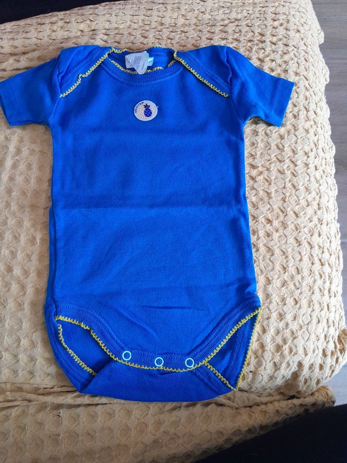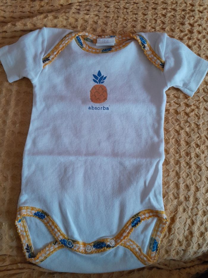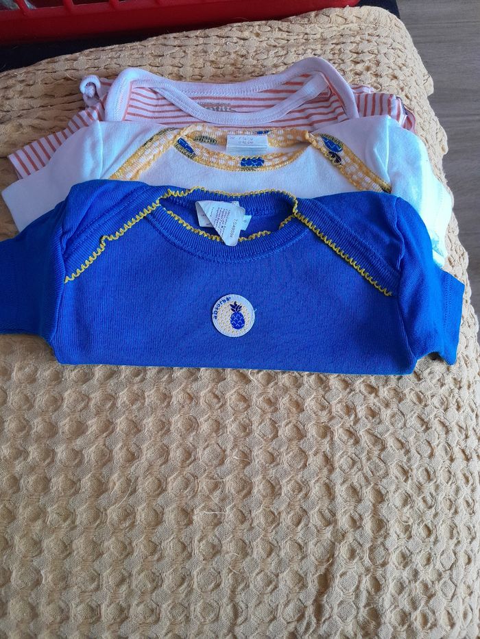 Vend lot de bodys manches courtes taille 3 mois en bon état. Pas abîmé au niveau des pressions. Le bleu et blanc sont de la marque absorba et le rayé est de la marque la compagnie des petits