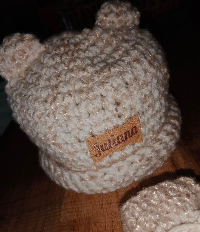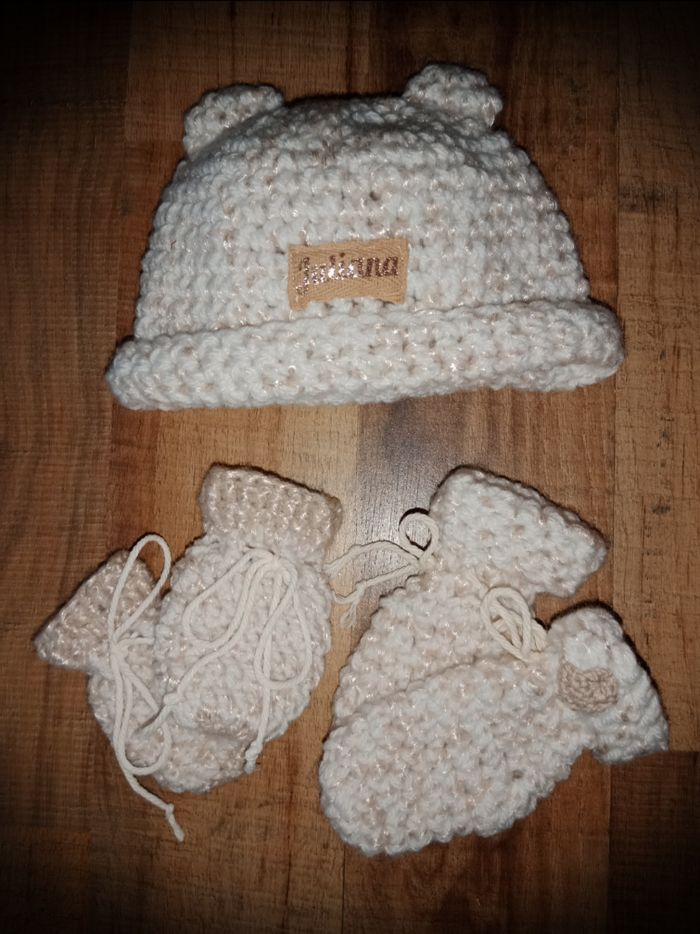 Bonnet, gant et chaussette entièrement fait main au crochet. Doublé laine acrylique/ laine satiné.
