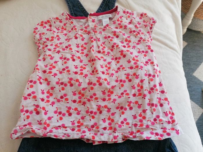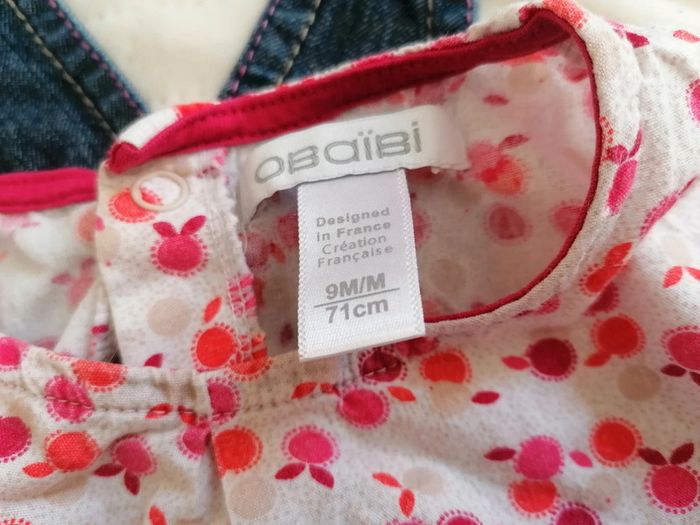 Tenue composée de : - 1 t-shirt à motif rose fushia, 9 mois, de chez Obaïbi. Boutons pression dans le dos, - 1 robe salopette en jean, taille petit 12 mois, in extensio. Le tout très peu porté donc pas eu le temps de bouger. #po1yn_12mois