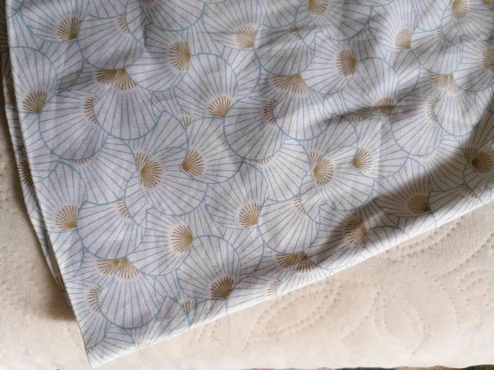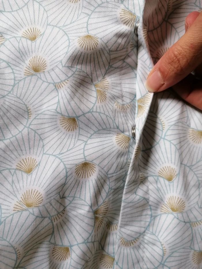Robe sans manche blanche à motif art déco bleu ciel et doré. Jamais portée, on voit encore les plis du rangement dans l'armoire. Taille 71cm. Boutons pression au dos cachés par un revers très élégant. #po1yn_12mois
