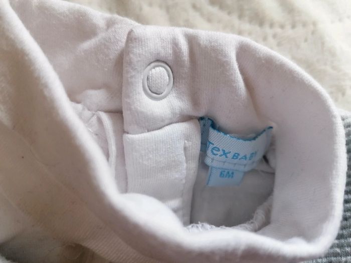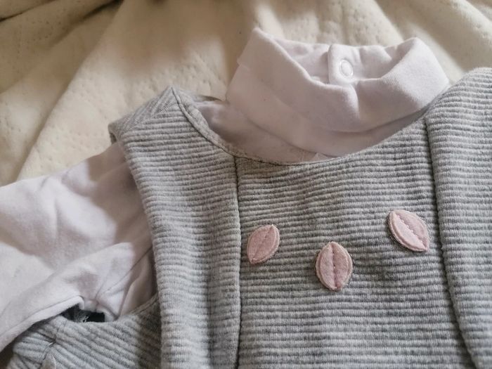 Lot tbe composé de : - 1 robe Obaïbi 6 mois, grise avec feuilles roses brodées, -1 sous pull Tex baby, 6 mois également, uni blanc, plutôt épais, - 1 collant rose poudré OFFERT car je ne le vendrai jamais seul ! #po1yn_6mois