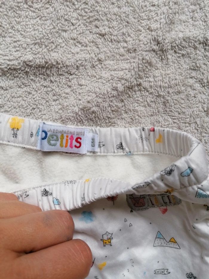 Pantalon blanc à motifs La Compagnie des Petits, doublé en coton effet pilou, en 6 mois. Porté par 1 enfant, il n'a pas bougé (change pour la crèche). #po1yn_6mois