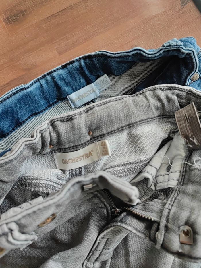 Lot de 2 jeans Stretchs Gris et bleu Taille ajustable On peut y ajouter des bretelles Certains endroits sont grattés pour faire un style... Marque Orchestra Taille 4 ans Bon état Envoi rapide #cyboulette44garcon4ans