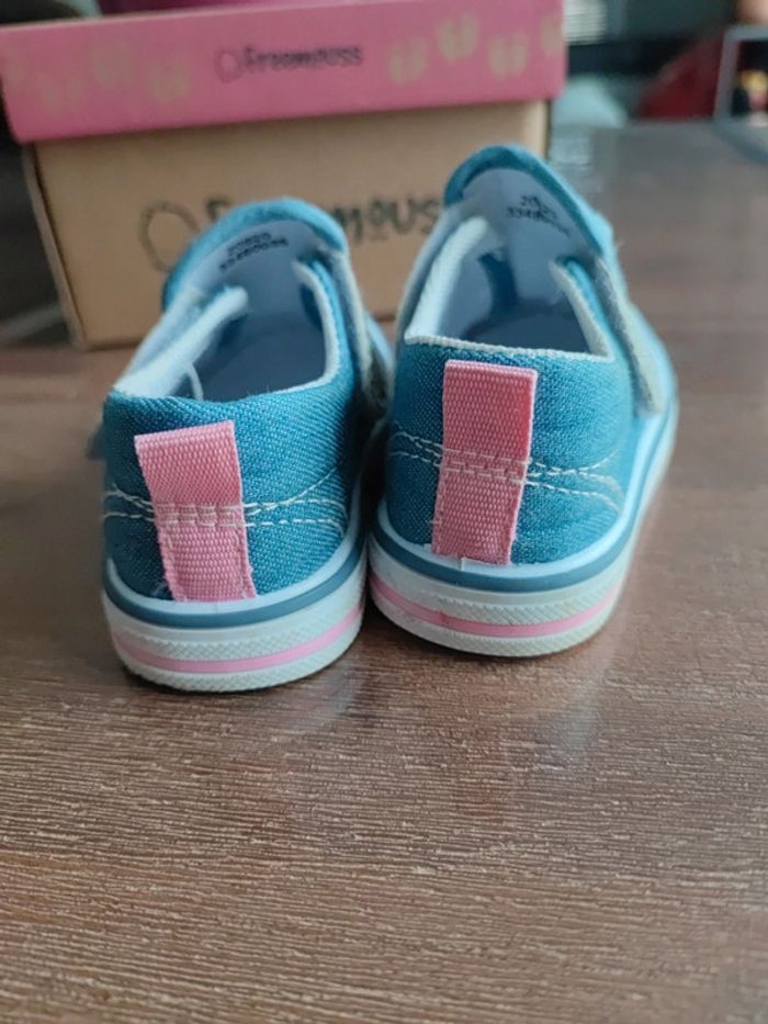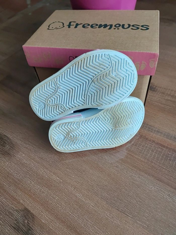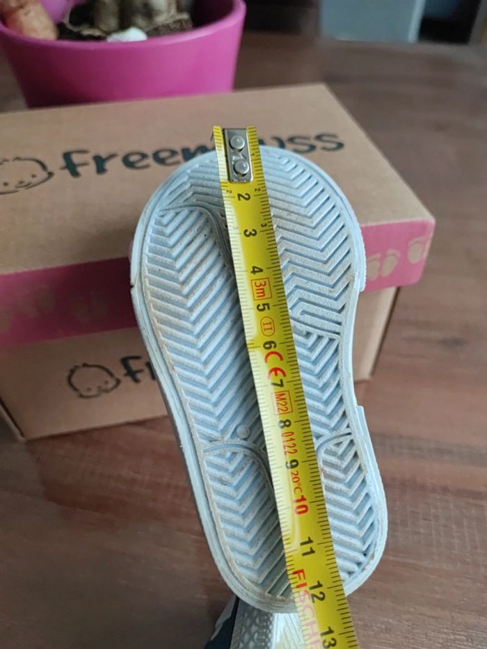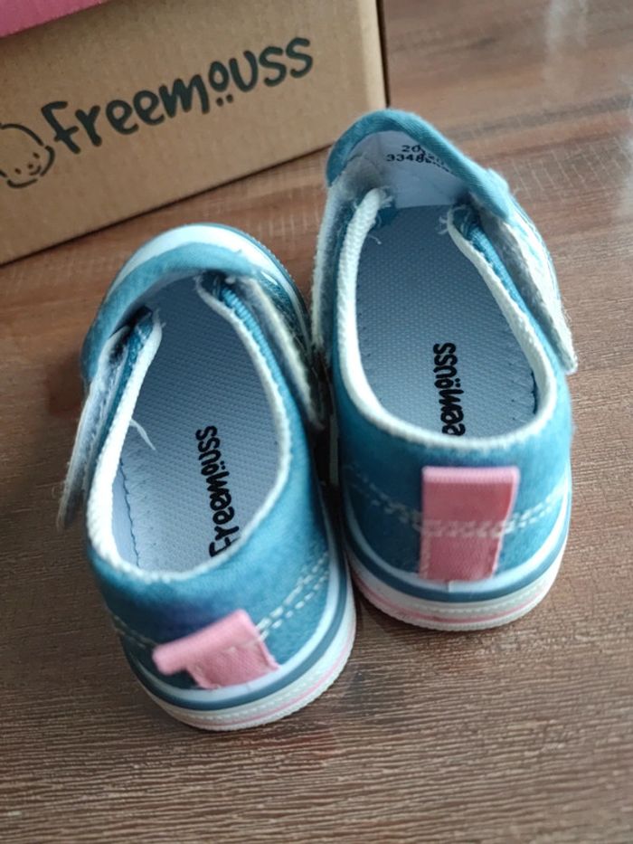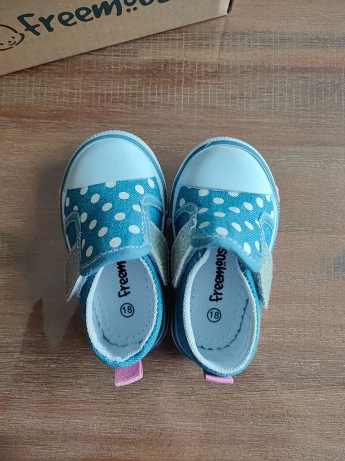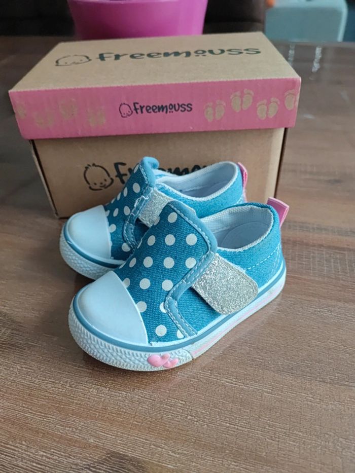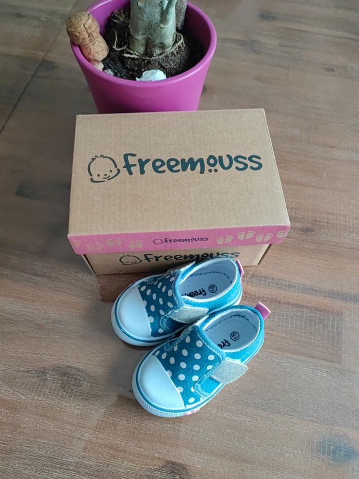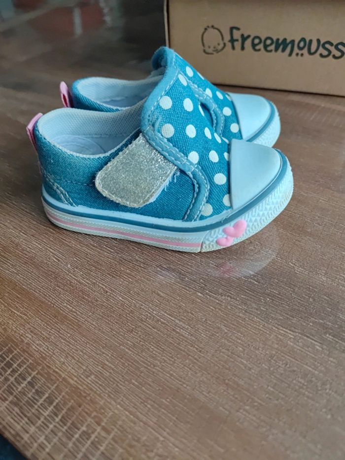 Jolies baskets Bleues jean a pois blanc Scratchs Petits coeurs roses sur le côté Portées que 4 fois par ma fille qui ne marche pas, qui se tient juste debout Je les laverai avant envoi Elles sont quasi neuves donc Marque Freemouss Pointure 18 Avec boîte d'origine #cyboulette44chaussuresenfant