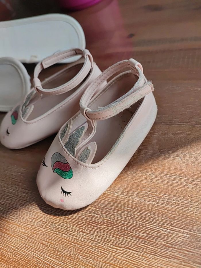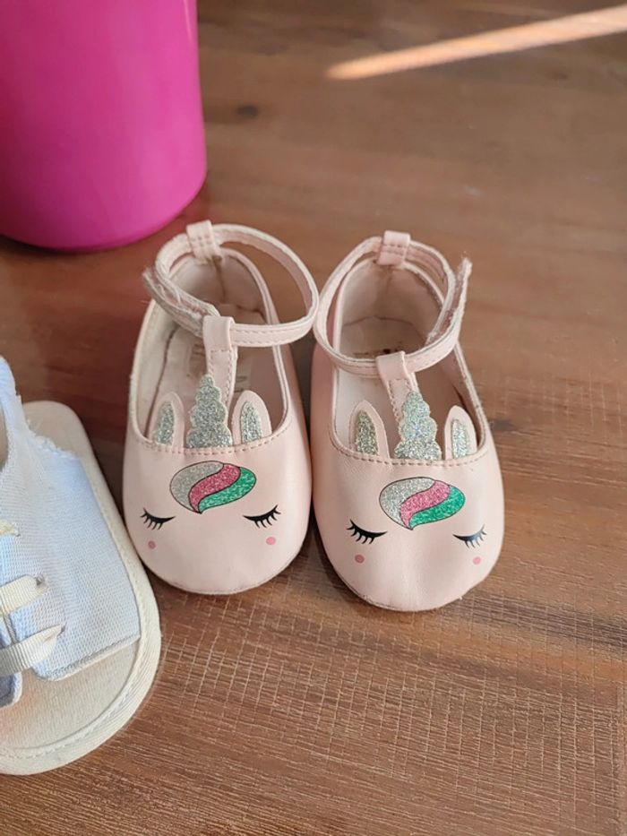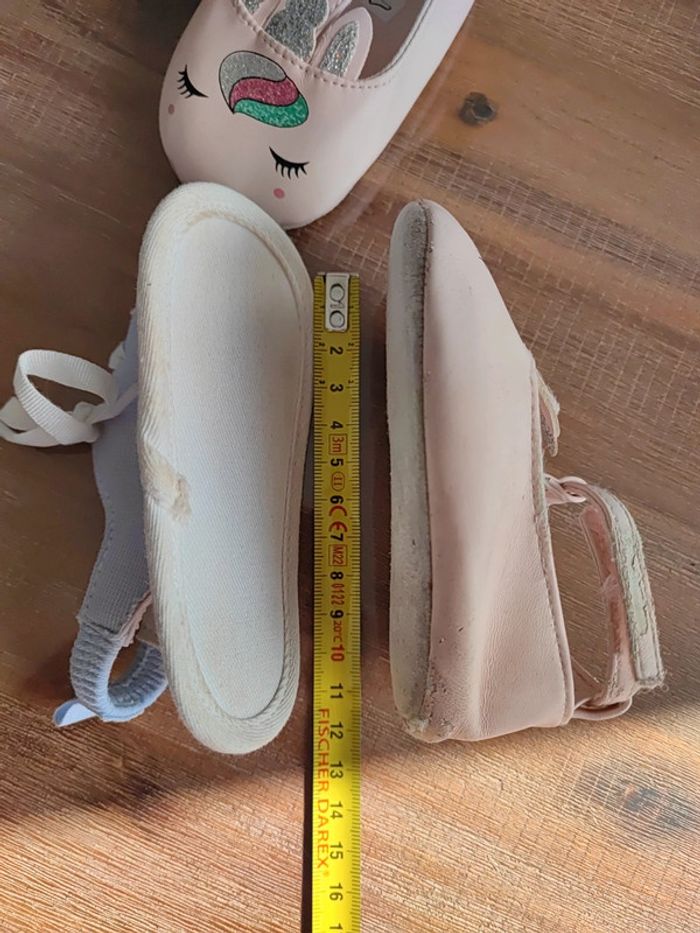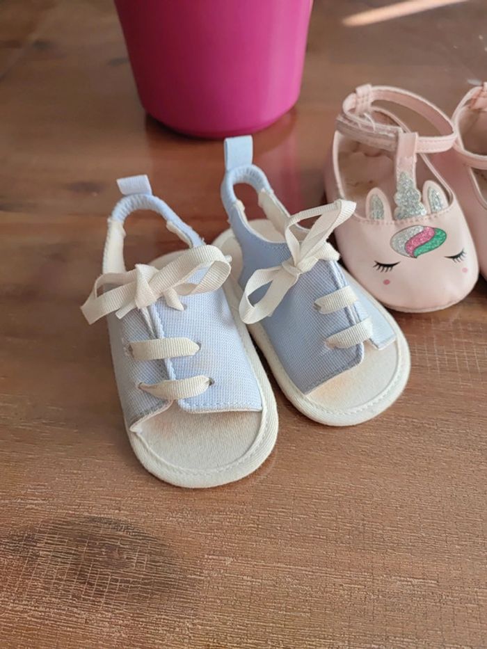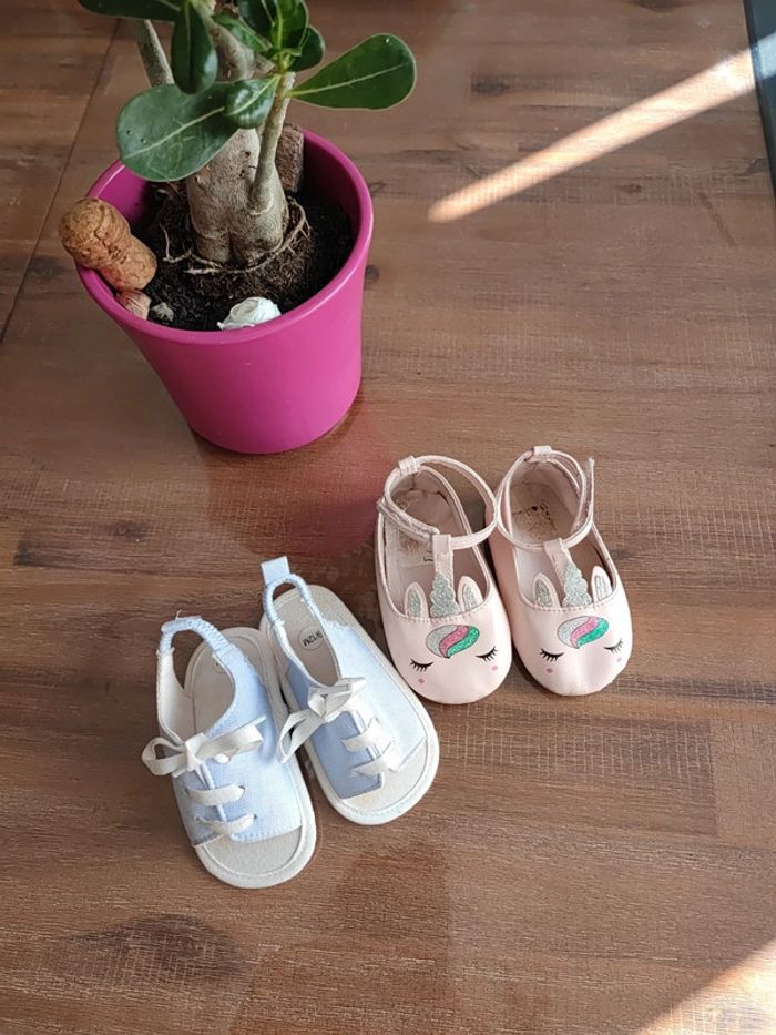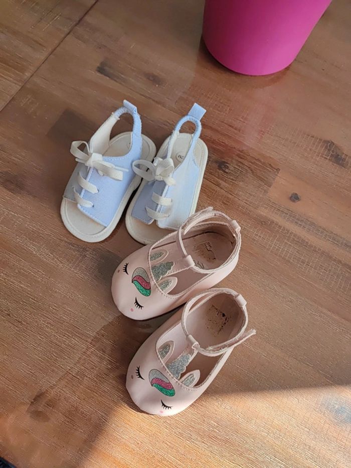 Lot de 2 paires semelles souples Une type sandales bleue claire, utilisée que 3 fois, bon état Une type ballerine rose claire avec motif licorne, un peu usée mais peuvent servir! Marque Orchestra Conviennent pour des pieds de 10,5/11cms Ma fille marche sur les fesses... #cyboulettes44chaussuresenfant