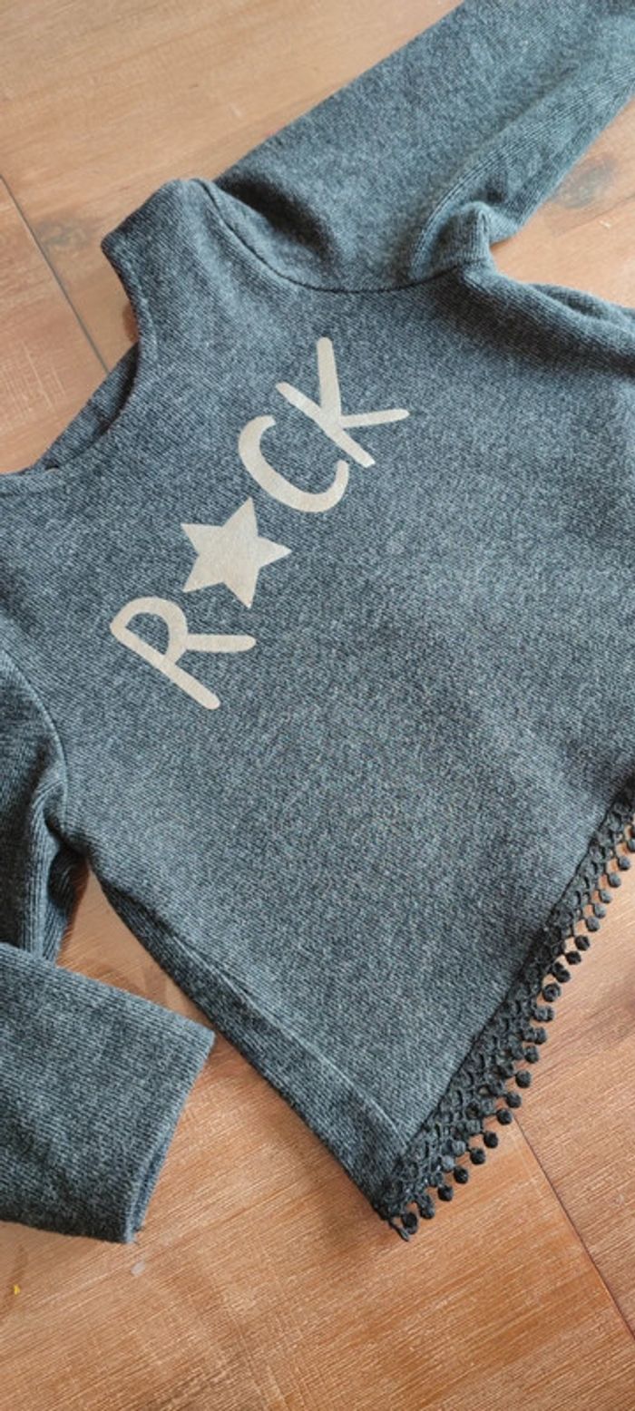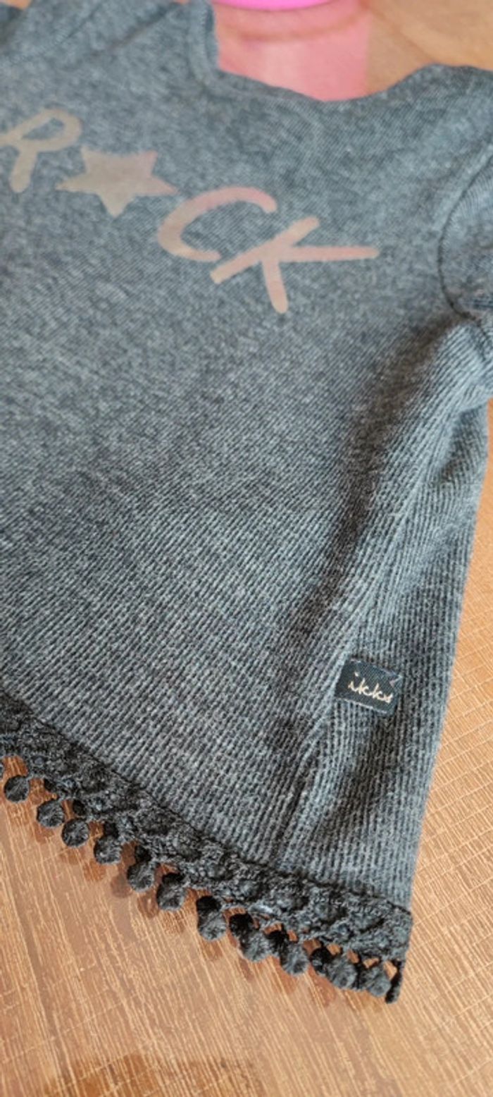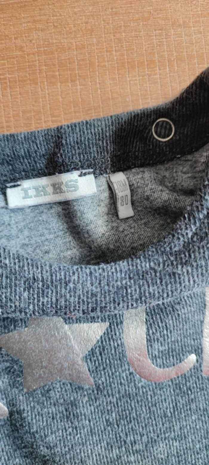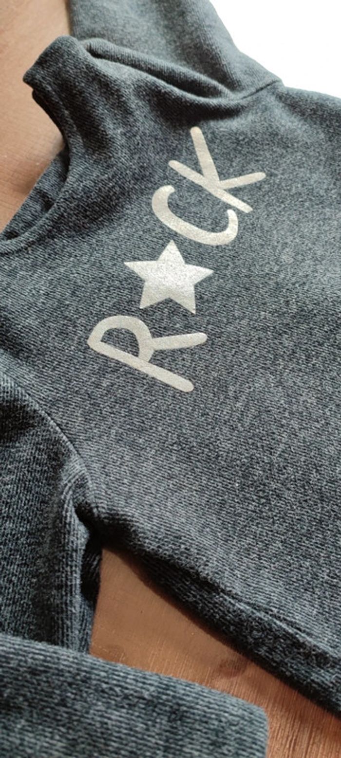 Gilet sweat fille 2 en 1: peut être porté dans les 2 sens (devant/derrière) Gris foncé avec finitions type dentelle noire Inscription Rock argenté Fermeture par 2 boutons IKKS Coupe originale Marque IKKS Taille 18 mois, 80 cms Très bon état, très peu porté Envoi rapide #cyboulette44fille18mois