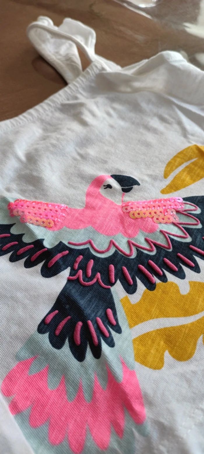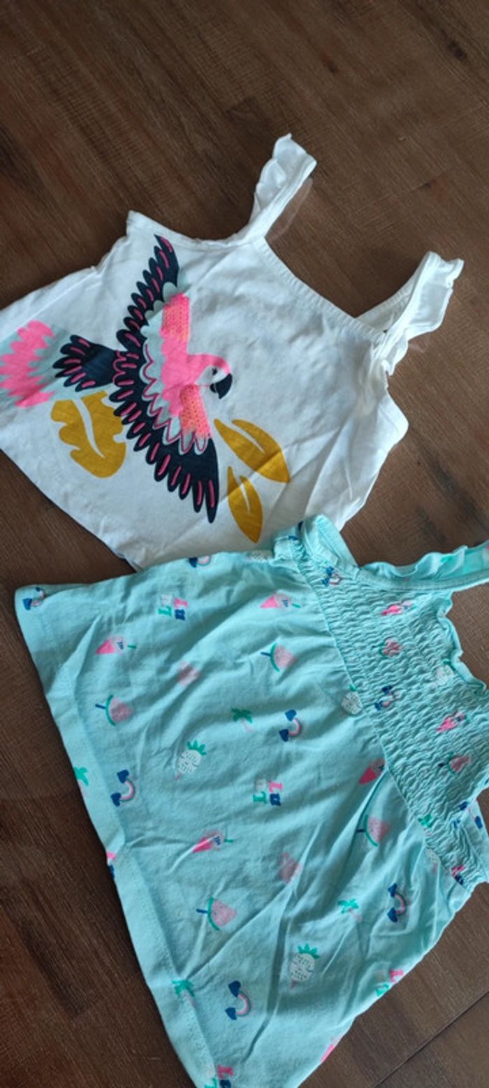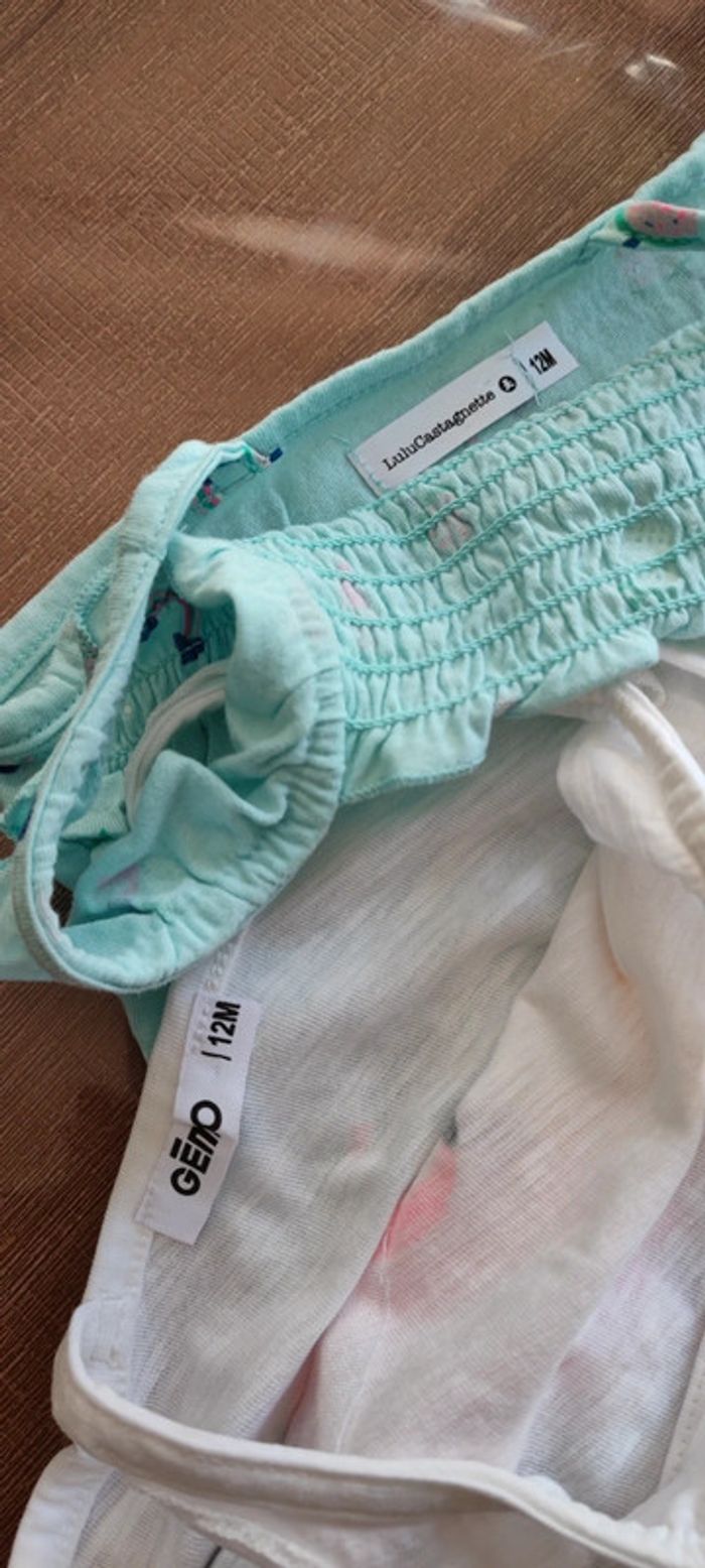 Lot de 2 débardeurs à bretelles Un blanc avec motif oiseau coloré et sequins Un bleu turquoise avec petits motifs été, froncages poitrine Bretelles avec volants État neuf, portés qu'une seule fois chacun Marque Gémo, Lulu Castagnette Taille 12 mois Envoi rapide #cyboulette44fille12mois