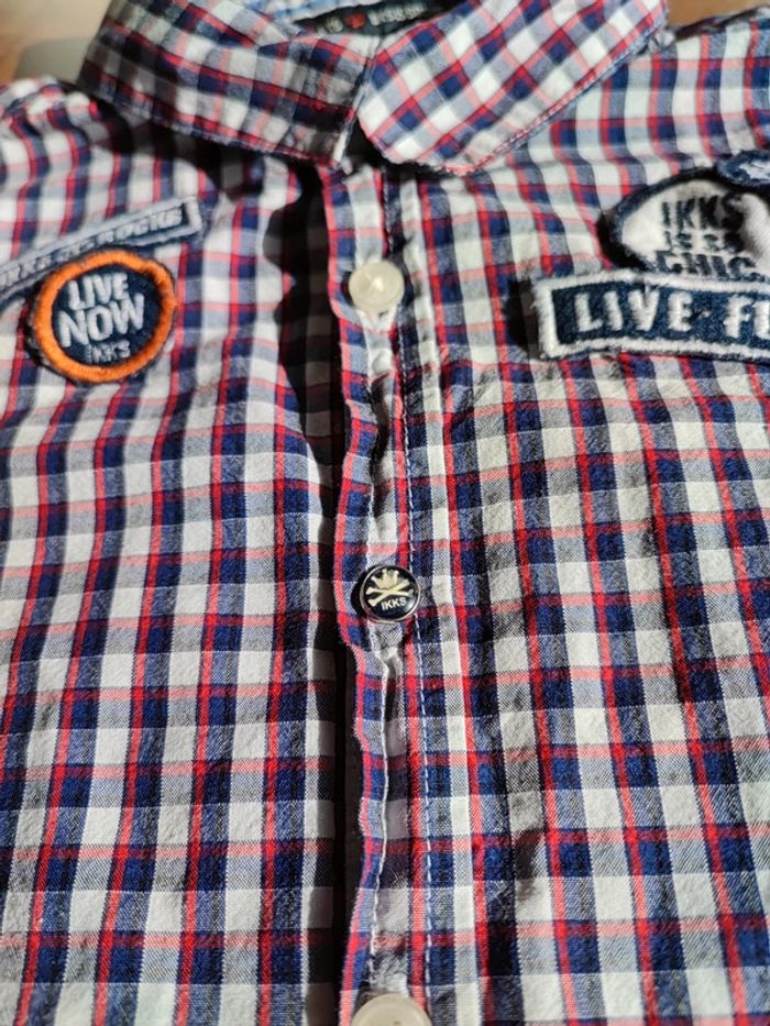 Chemise manches longues A boutons, dont 1 pression IKKS Rayures blanches, rouges et bleues marines Très jolie portée Écussons sur poitrine Inscription Live fully haut du dos Très bon état Marque IKKS Taille 4 ans Envoi rapide #cyboulette44garcon4ans