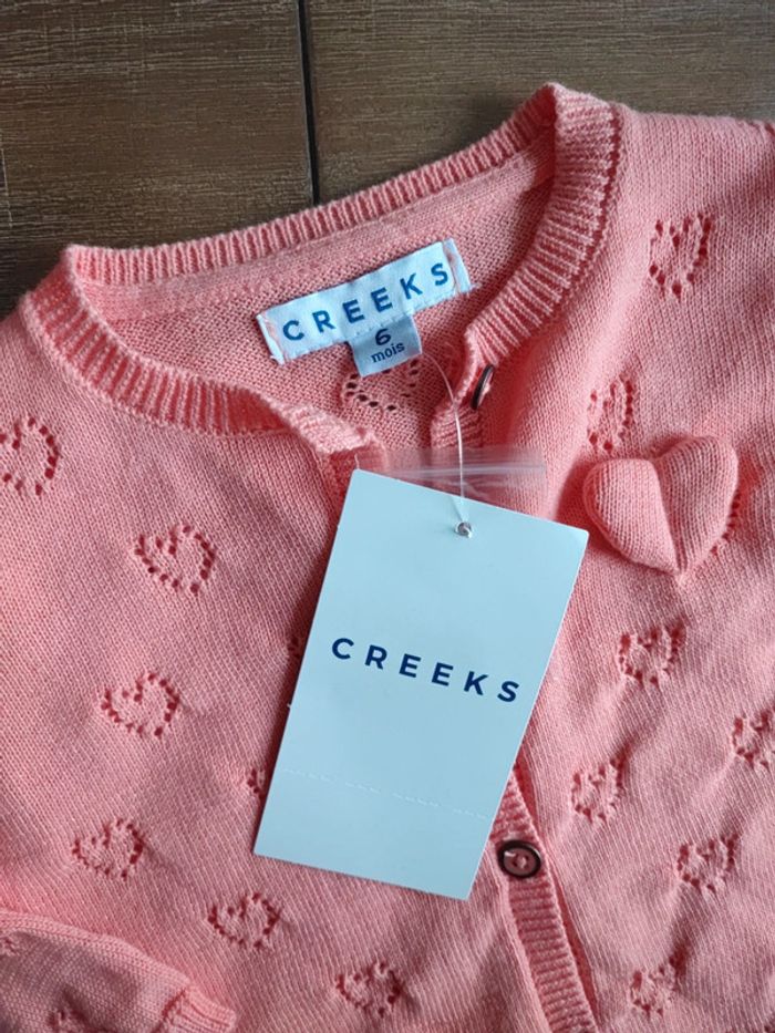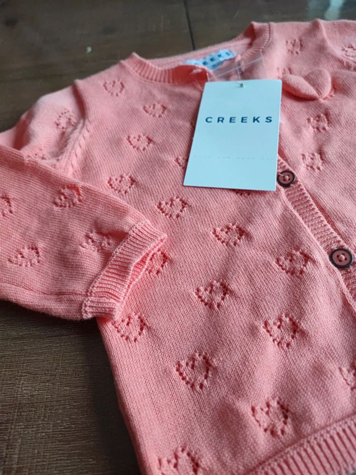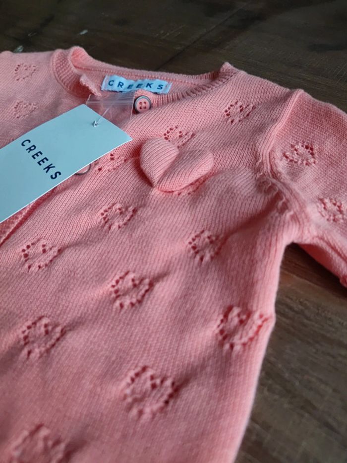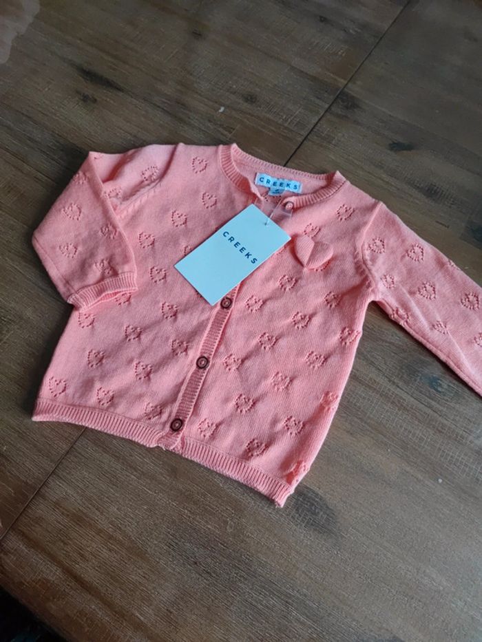 Joli gilet fille Couleur corail, saumon Avec motifs coeurs, et un coeur en relief Marque Creeks Neuf avec étiquette, jamais porté Taille 6 mois Envoi rapide #cyboulette44fille6mois