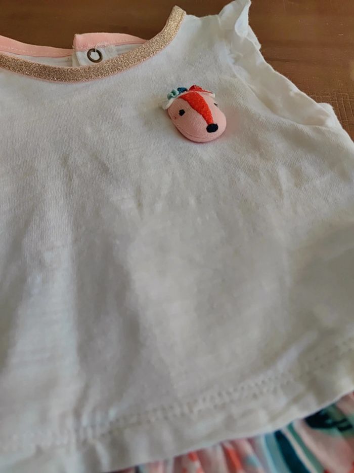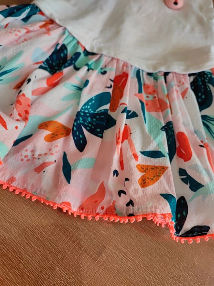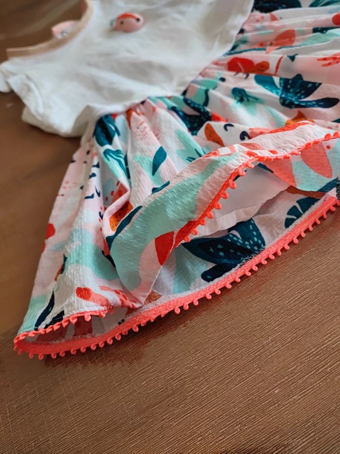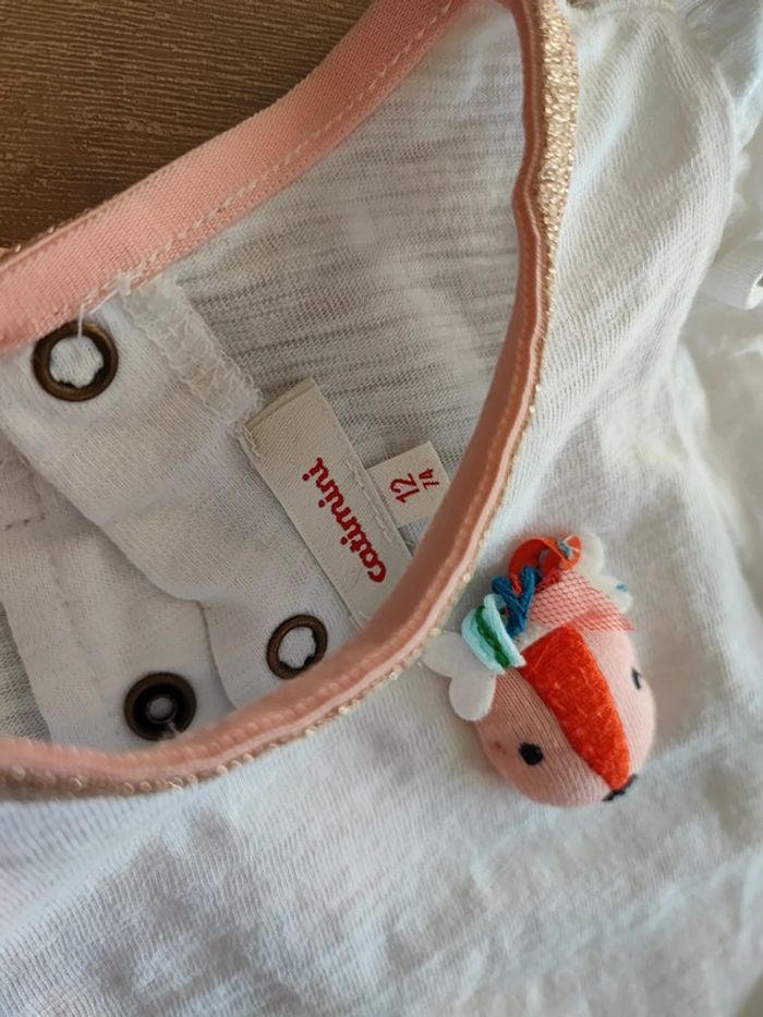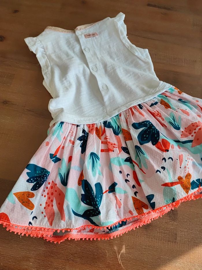 Robe haut blanc coton Bas coloré fluo avec finition corail, très pep's Tête biche en relief sur la poitrine Petite encolure dorée Sans manches Doublure fine jupon Fraîche et jolie Peu portée Très bon état Marque catimini Taille 12 mois #cyboulette44fille12mois