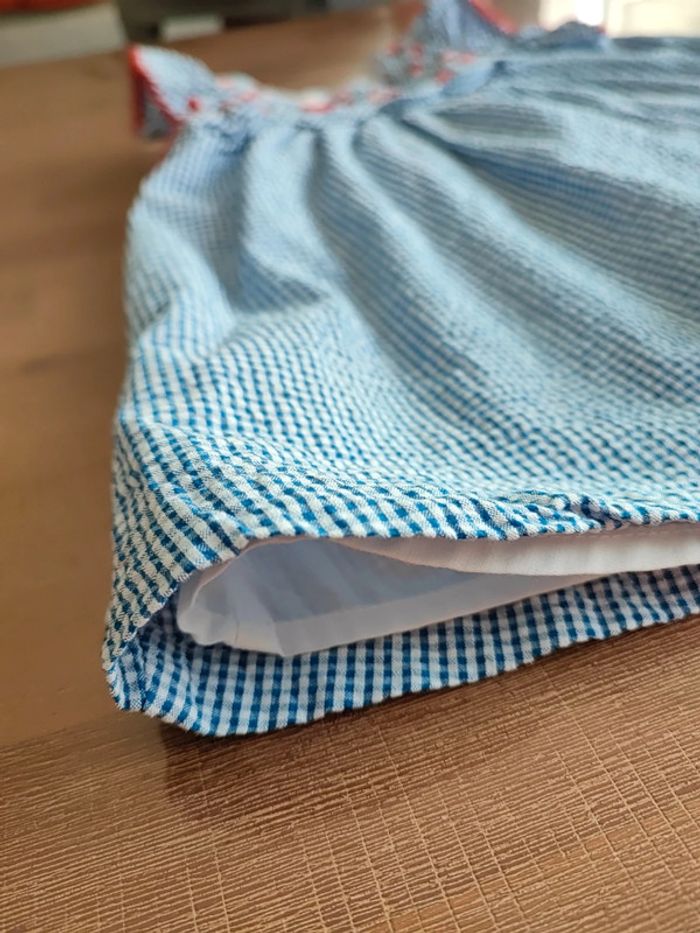 Jolie robe a carreaux bleus et blancs Finitions rouge Sans manches, volantée épaules Coupe évasée Doublure fine Bloomer assorti Portée que 2 fois État neuf Marque sergent major Taille 9 mois #cyboulette44fille9mois