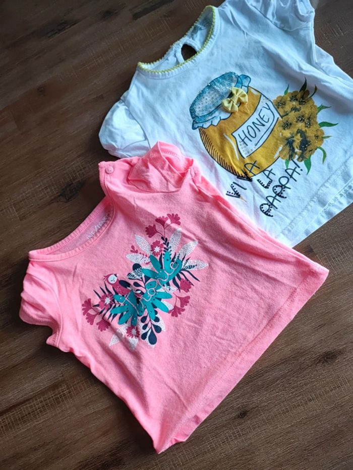 Lot de 2 tee shirts manches courtes Rose et blanc Taille 12 mois Le blanc est marqué 18 mois mais vaut pour 12 mois Bon état #cyboulette44fille12mois